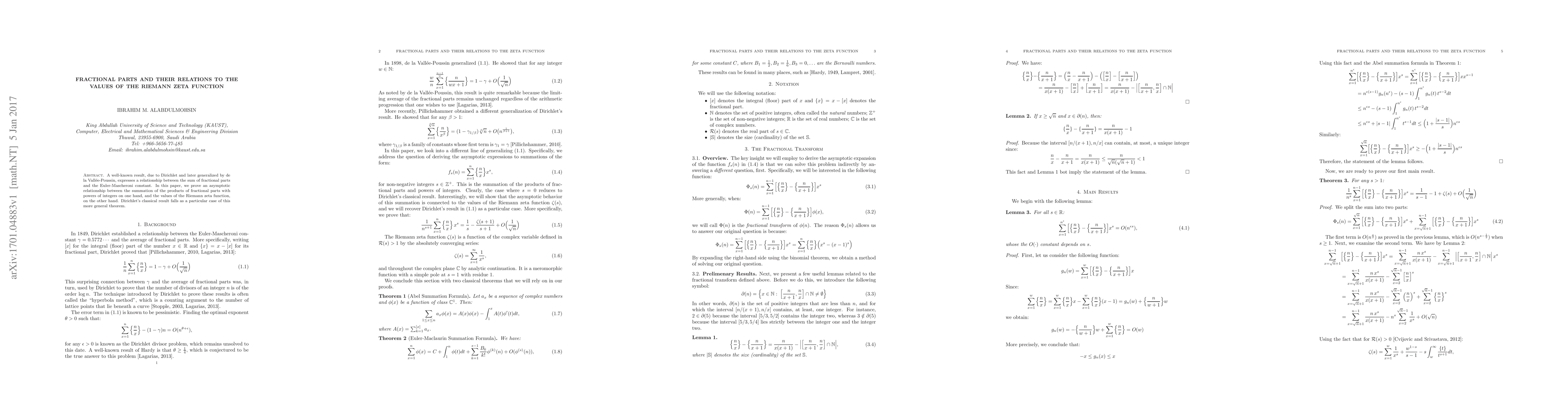 A well-known result, due to Dirichlet and later generalized by de la Vallee-Poussin, expresses a relationship between the sum of fractional parts and the Euler-Mascheroni constant. In this paper, we prove an asymptotic relationship between the summation of the products of fractional parts with powers of integers on one hand, and the values of the Riemann zeta function, on the other hand. Dirichlet's classical result falls as a particular case of this more general theorem.