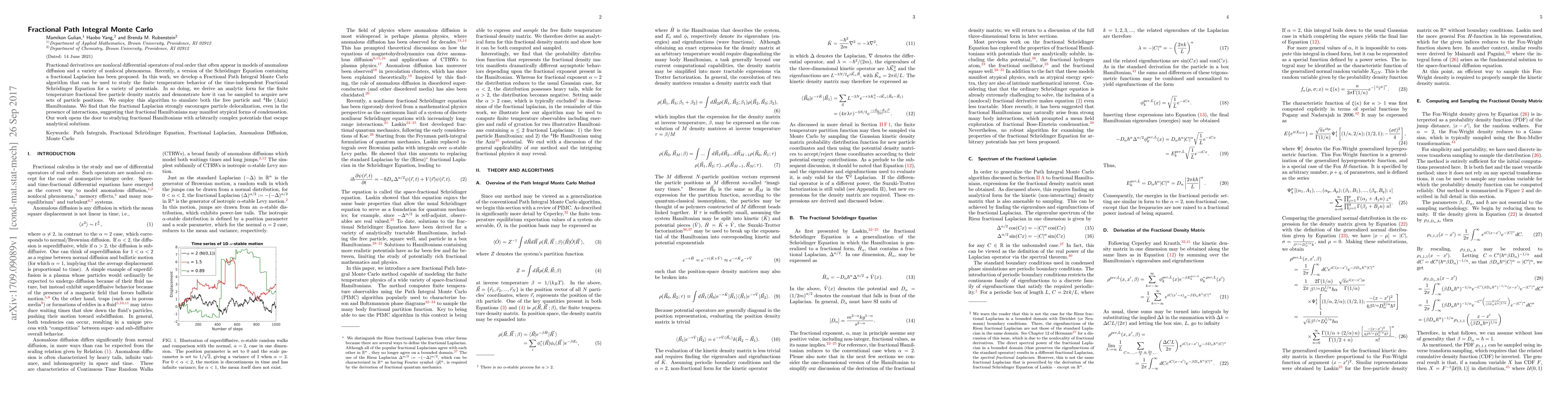 Fractional derivatives are nonlocal differential operators of real order that often appear in models of anomalous diffusion and a variety of nonlocal phenomena. Recently, a version of the Schr\"odinger Equation containing a fractional Laplacian has been proposed. In this work, we develop a Fractional Path Integral Monte Carlo algorithm that can be used to study the finite temperature behavior of the time-independent Fractional Schr\"odinger Equation for a variety of potentials. In so doing, we derive an analytic form for the finite temperature fractional free particle density matrix and demonstrate how it can be sampled to acquire new sets of particle positions. We employ this algorithm to simulate both the free particle and $^{4}$He (Aziz) Hamiltonians. We find that the fractional Laplacian strongly encourages particle delocalization, even in the presence of interactions, suggesting that fractional Hamiltonians may manifest atypical forms of condensation. Our work opens the door to studying fractional Hamiltonians with arbitrarily complex potentials that escape analytical solutions.