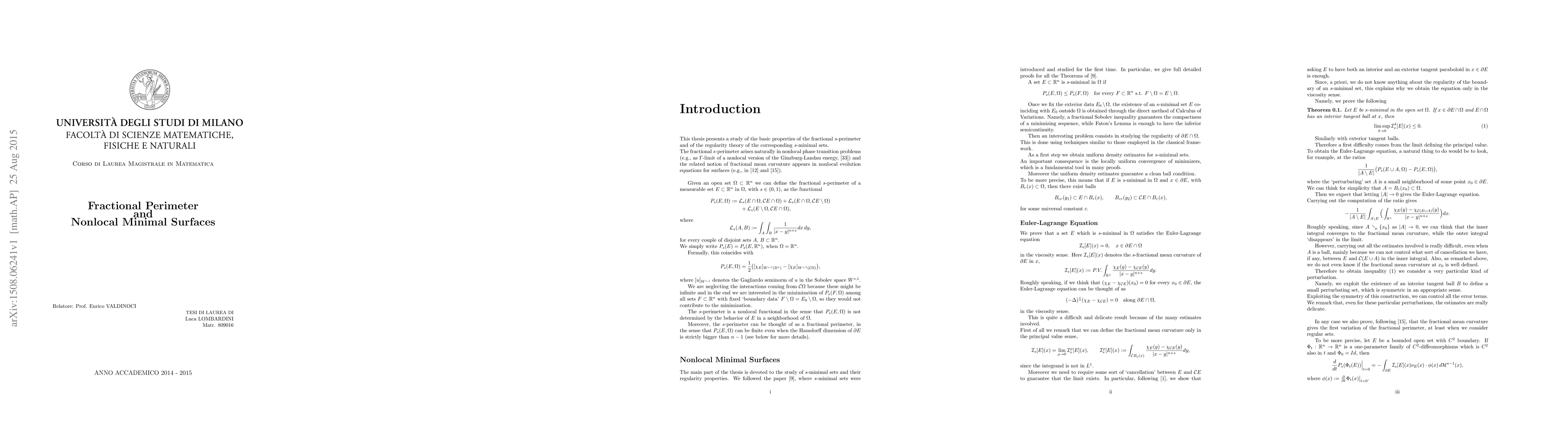 This Master's thesis explores the properties of the s-fractional perimeter and the regularity theory of s-minimal sets, providing detailed proofs for theorems introduced in Caffarelli, Roquejoffre, and Savin's work on nonlocal minimal surfaces.