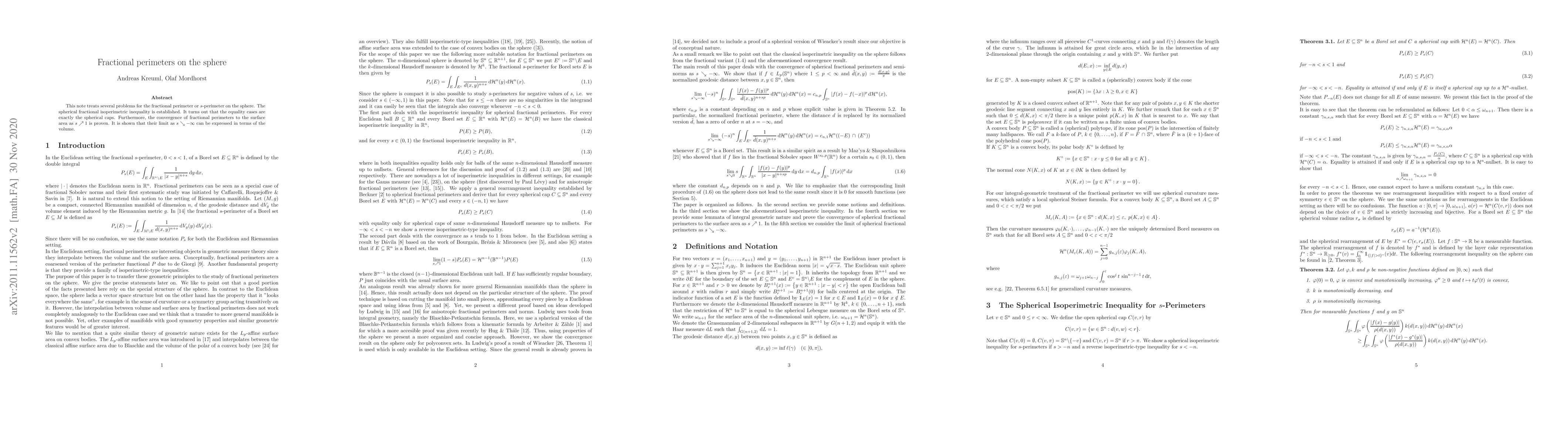 This note treats several problems for the fractional perimeter or $s$-perimeter on the sphere. The spherical fractional isoperimetric inequality is established. It turns out that the equality cases are exactly the spherical caps. Furthermore, the convergence of fractional perimeters to the surface area as $s \nearrow 1$ is proven. It is shown that their limit as $s \searrow -\infty$ can be expressed in terms of the volume.