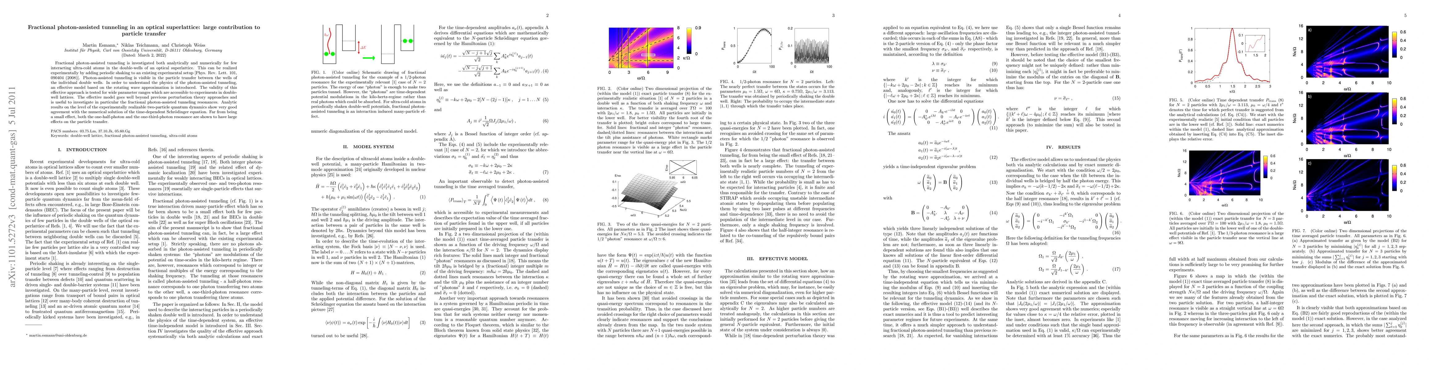 Fractional photon-assisted tunneling is investigated both analytically and numerically for few interacting ultra-cold atoms in the double-wells of an optical superlattice. This can be realized experimentally by adding periodic shaking to an existing experimental setup [Phys. Rev. Lett. 101, 090404 (2008)]. Photon-assisted tunneling is visible in the particle transfer between the wells of the individual double wells. In order to understand the physics of the photon-assisted tunneling, an effective model based on the rotating wave approximation is introduced. The validity of this effective approach is tested for wide parameter ranges which are accessible to experiments in double-well lattices. The effective model goes well beyond previous perturbation theory approaches and is useful to investigate in particular the fractional photon-assisted tunneling resonances. Analytic results on the level of the experimentally realizable two-particle quantum dynamics show very good agreement with the numerical solution of the time-dependent Schr\"odinger equation. Far from being a small effect, both the one-half-photon and the one-third-photon resonance are shown to have large effects on the particle transfer.