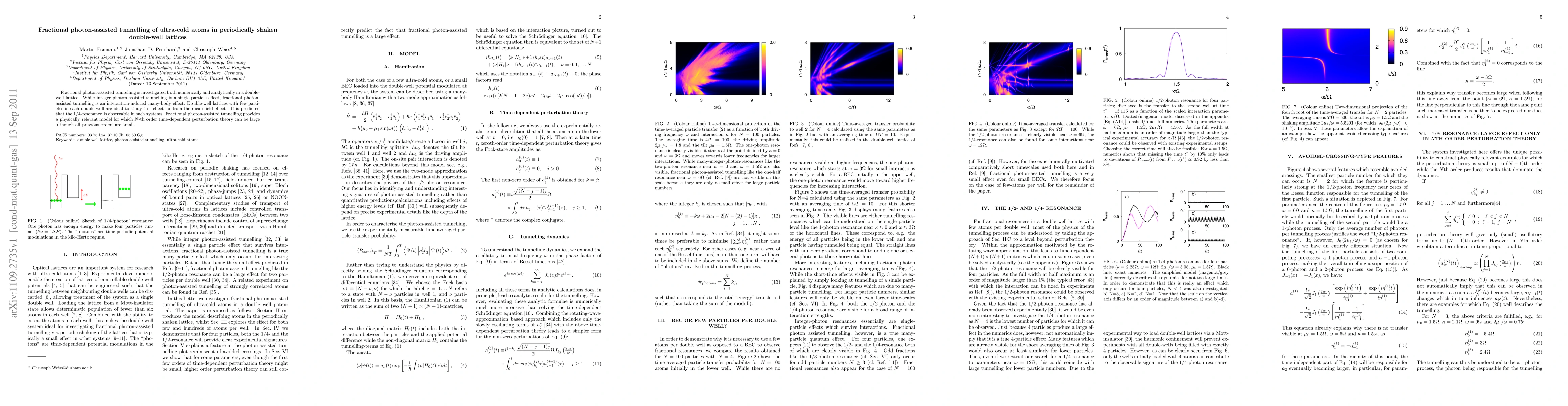 This paper investigates fractional photon-assisted tunnelling in ultra-cold atoms within periodically shaken double-well lattices, distinguishing it as a many-body effect compared to integer photon-assisted tunnelling. The study predicts observable 1/4-resonance, offering a model where higher-order perturbation theory becomes significant despite lower-order terms being negligible.