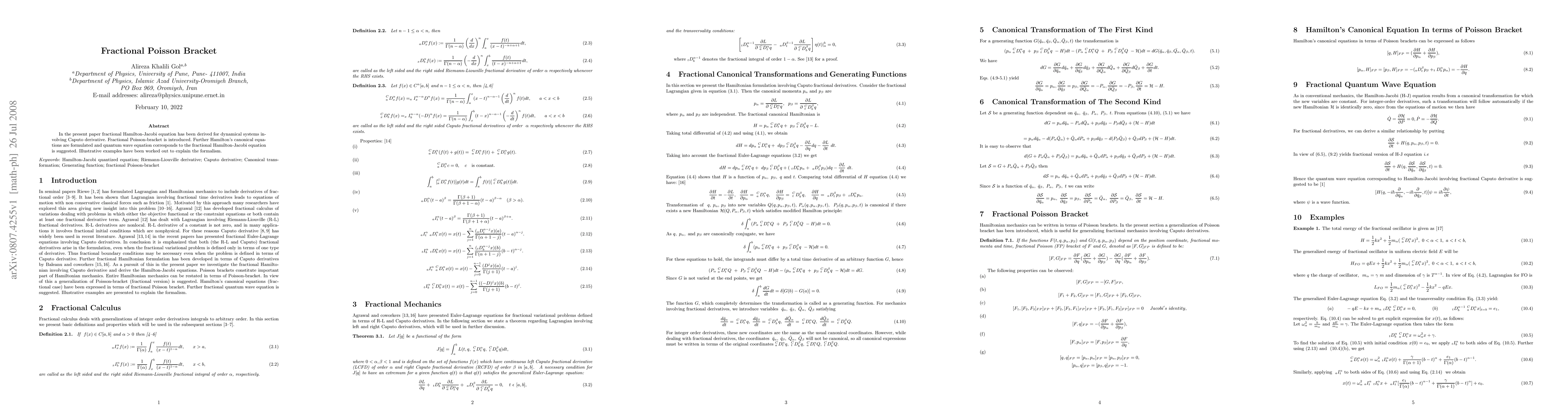 In the present paper fractional Hamilton-Jacobi equation has been derived for dynamical systems involving Caputo derivative. Fractional Poisson-bracket is introduced. Further Hamilton's canonical equations are formulated and quantum wave equation corresponds to the fractional Hamilton-Jacobi equation is suggested. Illustrative examples have been worked out to explain the formalism.