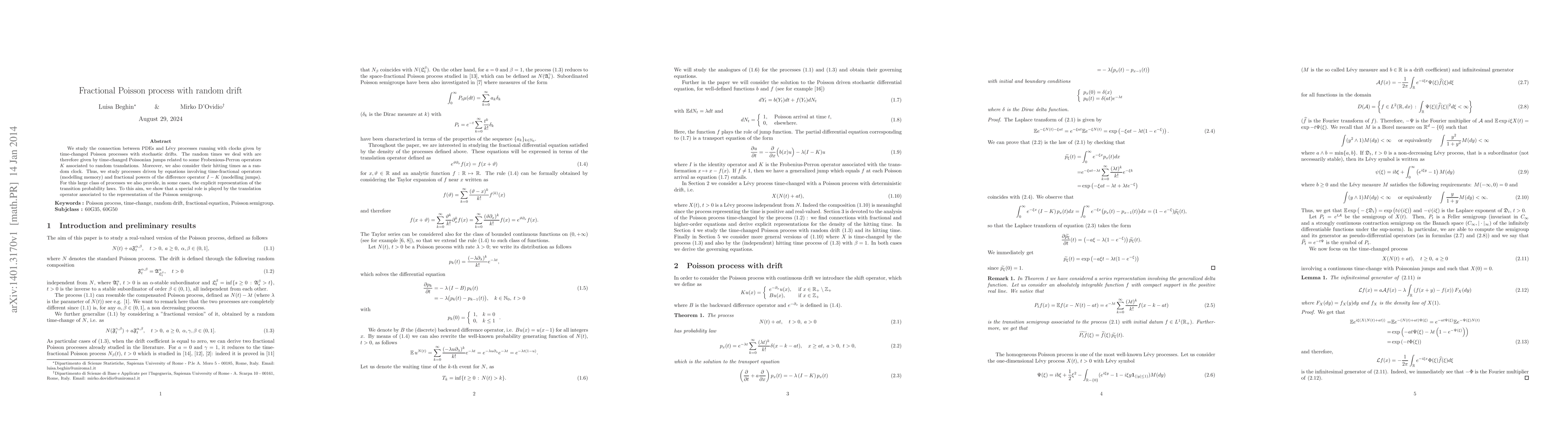 We study the connection between PDEs and L\'{e}vy processes running with clocks given by time-changed Poisson processes with stochastic drifts. The random times we deal with are therefore given by time-changed Poissonian jumps related to some Frobenious-Perron operators $K$ associated to random translations. Moreover, we also consider their hitting times as a random clock. Thus, we study processes driven by equations involving time-fractional operators (modelling memory) and fractional powers of the difference operator $I-K$ (modelling jumps). For this large class of processes we also provide, in some cases, the explicit representation of the transition probability laws. To this aim, we show that a special role is played by the translation operator associated to the representation of the Poisson semigroup.