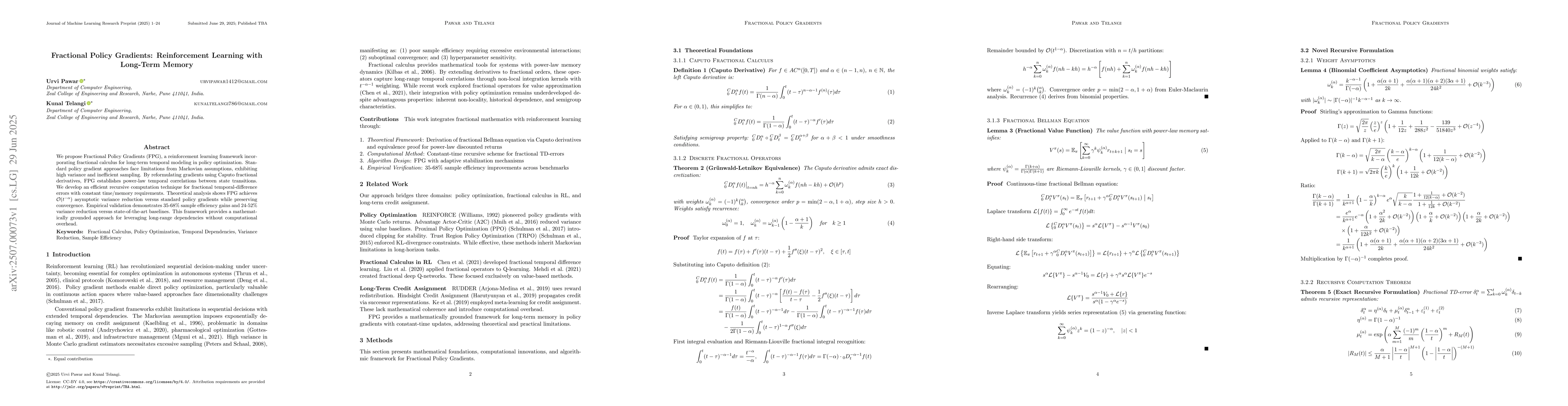 We propose Fractional Policy Gradients (FPG), a reinforcement learning framework incorporating fractional calculus for long-term temporal modeling in policy optimization. Standard policy gradient approaches face limitations from Markovian assumptions, exhibiting high variance and inefficient sampling. By reformulating gradients using Caputo fractional derivatives, FPG establishes power-law temporal correlations between state transitions. We develop an efficient recursive computation technique for fractional temporal-difference errors with constant time and memory requirements. Theoretical analysis shows FPG achieves asymptotic variance reduction of order O(t^(-alpha)) versus standard policy gradients while preserving convergence. Empirical validation demonstrates 35-68% sample efficiency gains and 24-52% variance reduction versus state-of-the-art baselines. This framework provides a mathematically grounded approach for leveraging long-range dependencies without computational overhead.