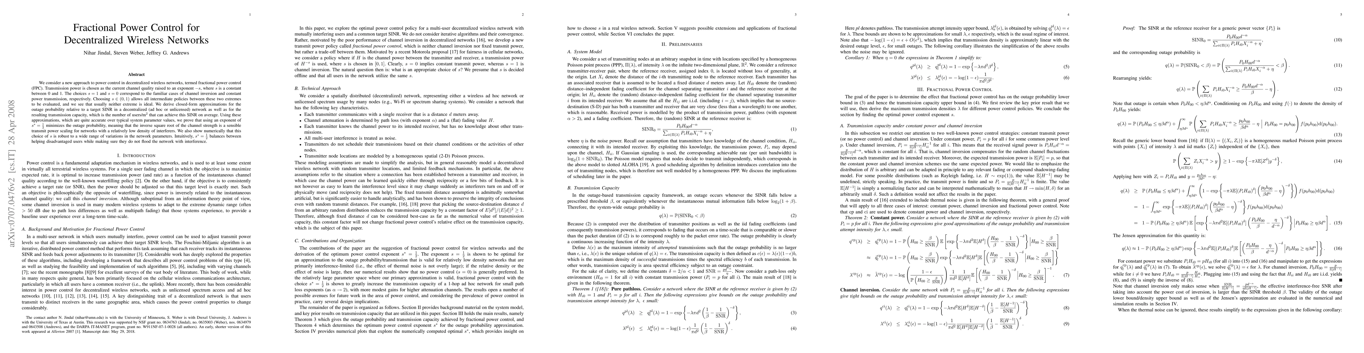 This paper introduces fractional power control (FPC) for decentralized wireless networks, where transmission power is adjusted based on current channel quality raised to an exponent s (0 < s < 1). The study finds that an exponent of 1/2 minimizes outage probability, balancing user support and interference management.