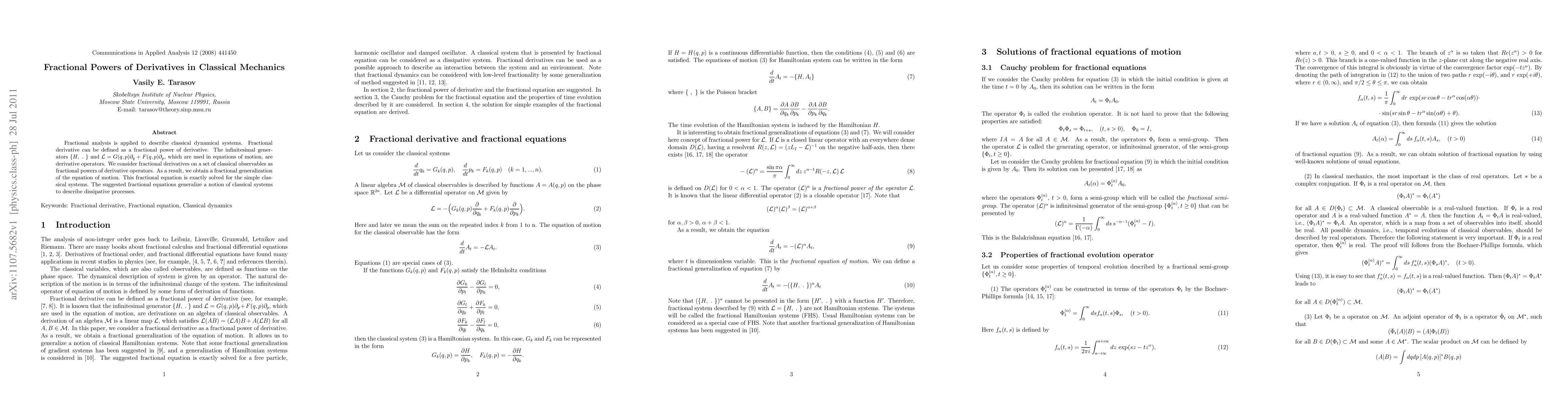 This paper applies fractional analysis to classical mechanics, defining fractional derivatives as fractional powers of derivative operators. The authors derive a fractional generalization of the equation of motion, which is exactly solved for simple classical systems, thereby extending classical mechanics to describe dissipative processes.