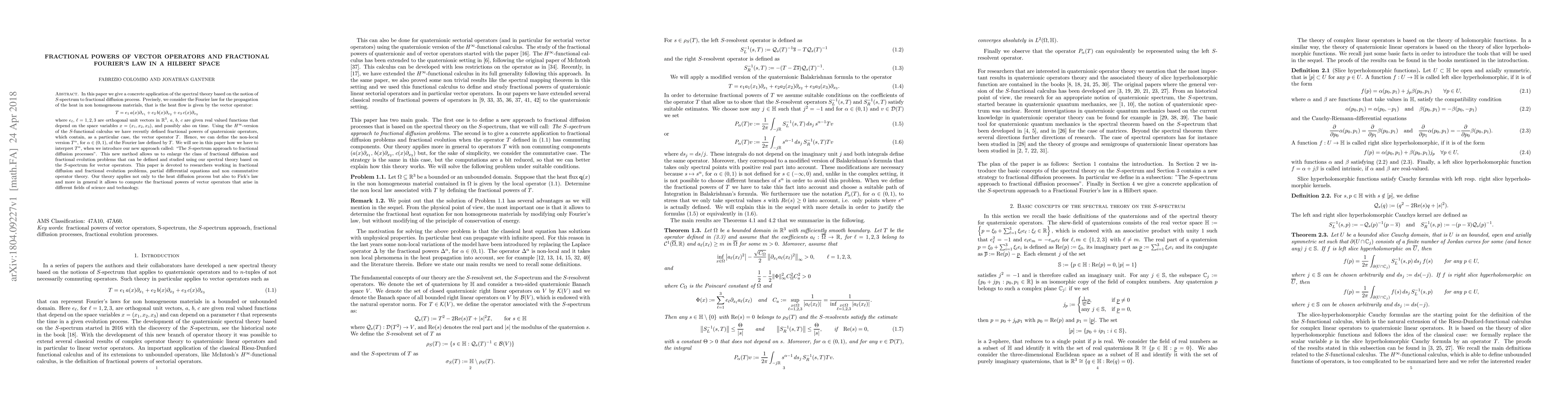 Researchers developed a new method to study fractional diffusion processes using spectral theory based on $S$-spectrum for vector operators, enabling the computation of non-local versions of physical laws like Fourier's law in non-homogeneous materials.