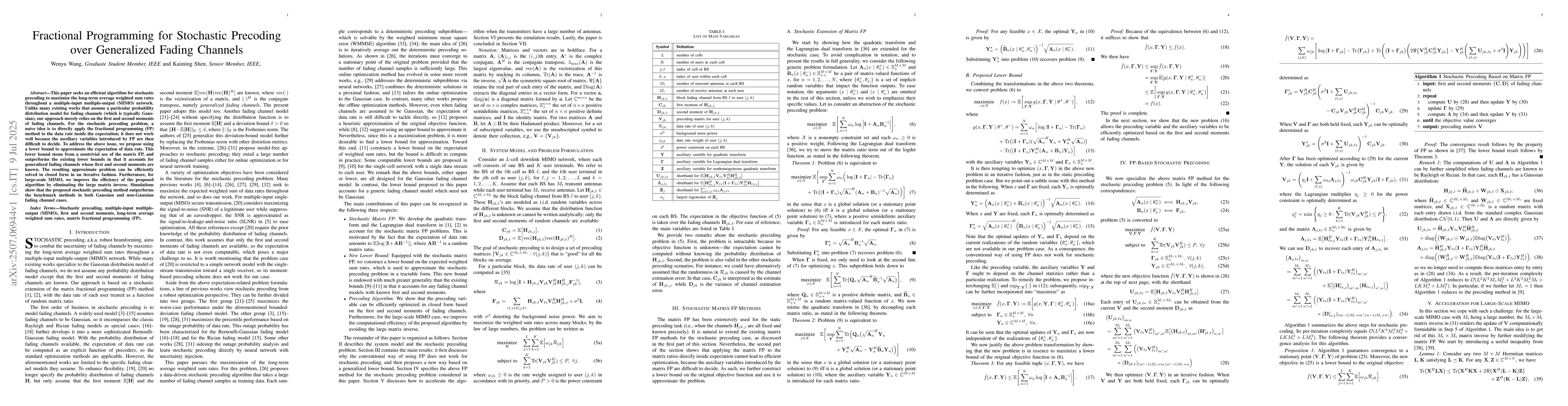 This paper seeks an efficient algorithm for stochastic precoding to maximize the long-term average weighted sum rates throughout a multiple-input multiple-output (MIMO) network. Unlike many existing works that assume a particular probability distribution model for fading channels (which is typically Gaussian), our approach merely relies on the first and second moments of fading channels. For the stochastic precoding problem, a naive idea is to directly apply the fractional programming (FP) method to the data rate inside the expectation; it does not work well because the auxiliary variables introduced by FP are then difficult to decide. To address the above issue, we propose using a lower bound to approximate the expectation of data rate. This lower bound stems from a nontrivial use of the matrix FP, and outperforms the existing lower bounds in that it accounts for generalized fading channels whose first and second moments are known. The resulting approximate problem can be efficiently solved in closed form in an iterative fashion. Furthermore, for large-scale MIMO, we improve the efficiency of the proposed algorithm by eliminating the large matrix inverse. Simulations show that the proposed stochastic precoding method outperforms the benchmark methods in both Gaussian and non-Gaussian fading channel cases.