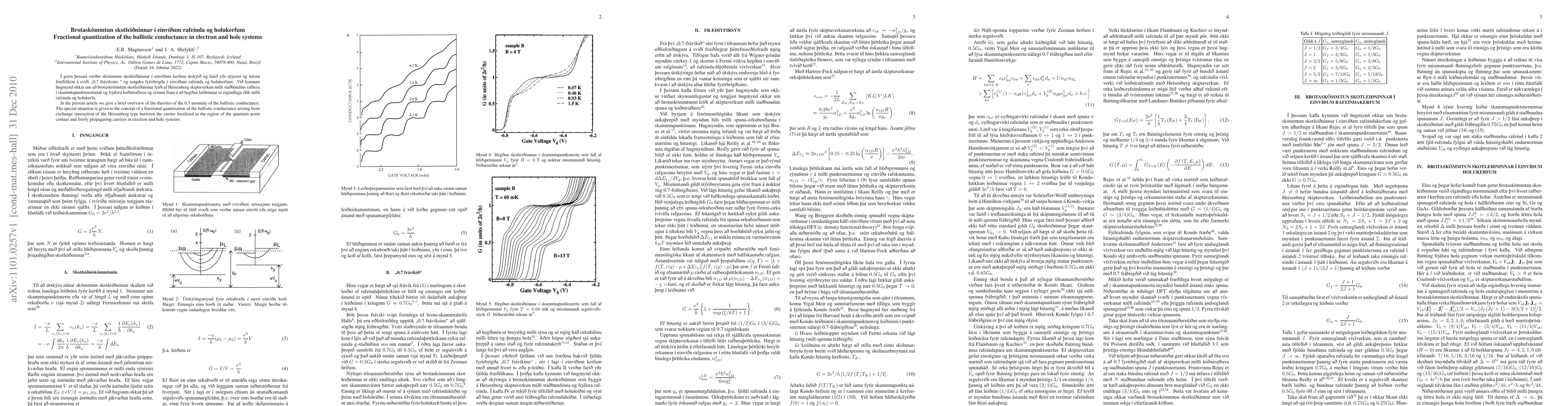 In the present article we give a brief overview of the theories of the 0.7 anomaly of the ballistic conductance. The special attantion is given to the concept of a fractional quantization of the ballistic conductance arising from exchange interaction of the Heisenberg type between the carrier localized in the region of the quantum point contact and freely propagating carriers in electron and hole systems. ----- Brotask\"ommtun skotlei{\eth}ninnar \'i einv\'i{\eth}um rafeinda og holukerfum \'I grein {\th}essari ver{\eth}ur sk\"ommtun skotlei{\eth}ninnar \'i einv\'i{\eth}um kerfum \'utsk\'yr{\eth} og fari{\eth} yfir n\'yjustu og helstu fr{\ae}{\eth}il\'ik\"on \'a svi{\eth}i \LDQ 0,7 fr\'aviksins \RDQ og tengdra fyrirbrig{\eth}a \'i einv\'i{\eth}um rafeinda og holukerfum. Vi{\eth} kynnum hugmynd okkar um a{\eth} brotask\"ommtun skotlei{\eth}ninnar lei{\eth}i af Heisenberg skiptaverkun milli sta{\eth}bundins rafbera \'i skammtapunktsnertunni og frj\'alsra lei{\eth}nirafbera og s\'ynum fram \'a a{\eth} heg{\eth}un lei{\eth}ninnar er eigindlega \'ol\'ik milli rafeinda og holukerfa.