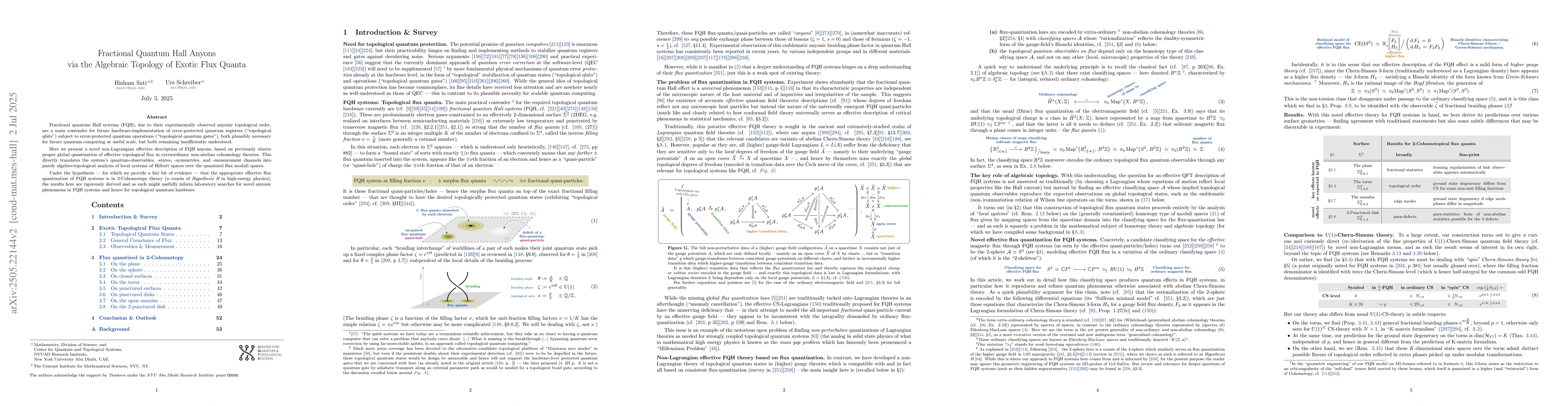 Fractional quantum Hall systems (FQH), due to their experimentally observed anyonic topological order, are a main contender for future hardware-implementation of error-protected quantum registers ("topological qbits") subject to error-protected quantum operations ("topological quantum gates"), both plausibly necessary for future quantum computing at useful scale, but both remaining insufficiently understood. Here we present a novel non-Lagrangian effective description of FQH anyons, based on previously elusive proper global quantization of effective topological flux in extraordinary non-abelian cohomology theories. This directly translates the system's quantum-observables, -states, -symmetries, and -measurement channels into purely algebro-topological analysis of local systems of Hilbert spaces over the quantized flux moduli spaces. Under the hypothesis -- for which we provide a fair bit of evidence -- that the appropriate effective flux quantization of FQH systems is in 2-Cohomotopy theory (a cousin of Hypothesis H in high-energy physics), the results here are rigorously derived and as such might usefully inform laboratory searches for novel anyonic phenomena in FQH systems and hence for topological quantum hardware.