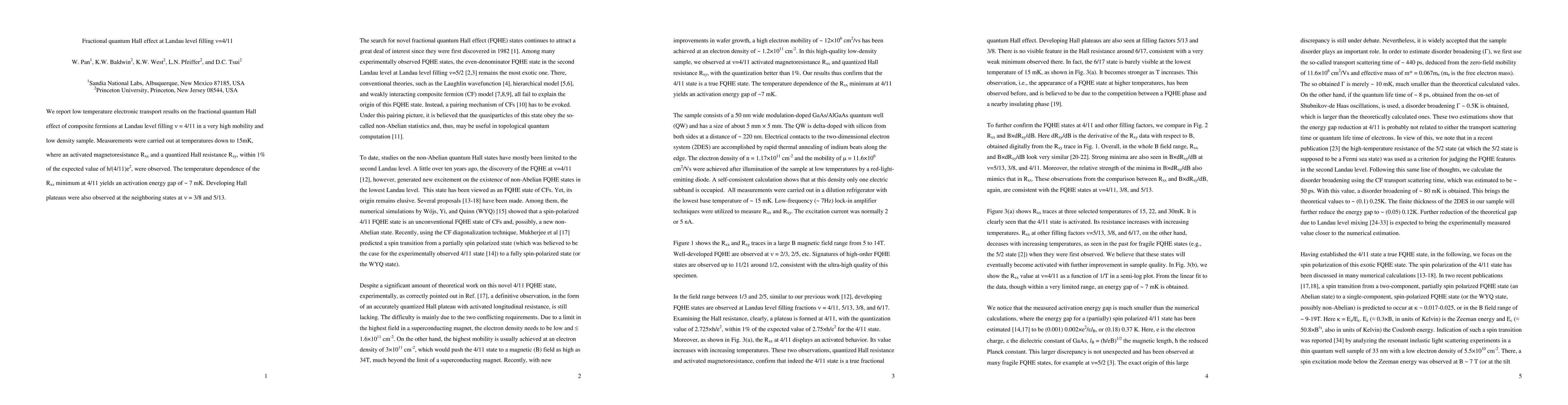 This study investigates the fractional quantum Hall effect at Landau level filling nu = 4/11, revealing an activated magnetoresistance and a quantized Hall resistance, confirming theoretical predictions. The temperature dependence indicates an activation energy gap of ~7 mK.