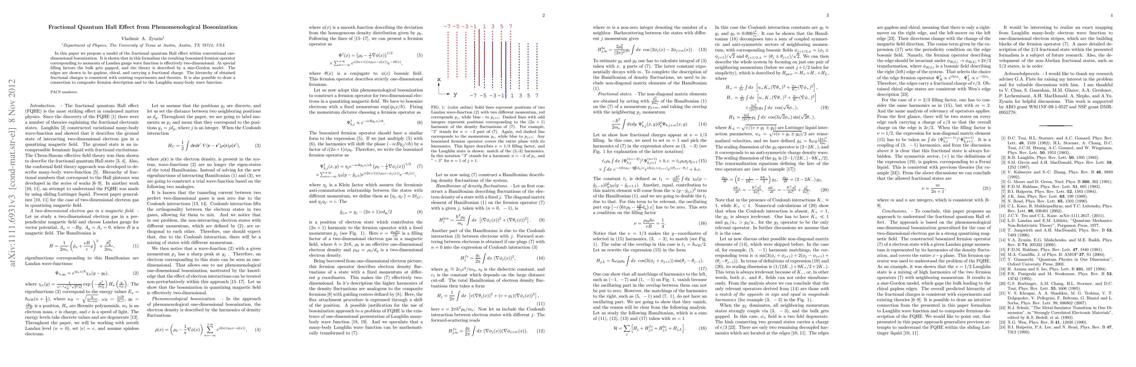 This paper proposes a model of the fractional quantum Hall effect using one-dimensional bosonization, demonstrating that the bosonized fermion operator behaves like a two-dimensional entity. The model shows gapped bulk at specific filling factors and describes edges with chiral, gapless, and fractionally charged states, consistent with experimental observations and composite fermion theory.