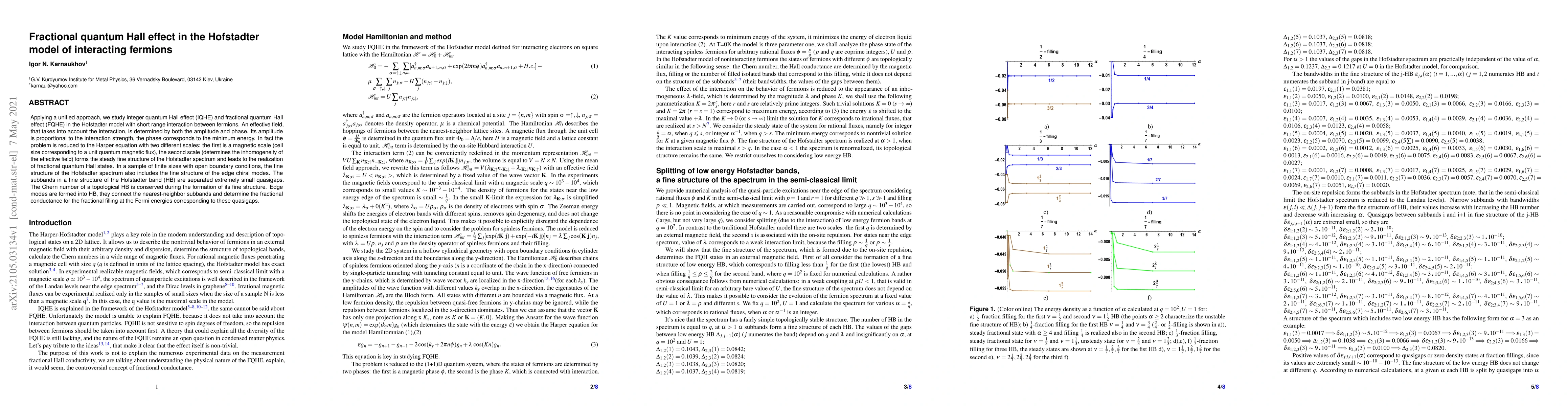 Applying a unified approach, we study integer quantum Hall effect (IQHE) and fractional quantum Hall effect (FQHE) in the Hofstadter model with short range interaction between fermions. An effective field, that takes into account the interaction, is determined by both the amplitude and phase. Its amplitude is proportional to the interaction strength, the phase corresponds to the minimum energy. In fact the problem is reduced to the Harper equation with two different scales: the first is a magnetic scale (cell size corresponding to a unit quantum magnetic flux), the second scale (determines the inhomogeneity of the effective field) forms the steady fine structure of the Hofstadter spectrum and leads to the realization of fractional quantum Hall states. In a sample of finite sizes with open boundary conditions, the fine structure of the Hofstadter spectrum also includes the fine structure of the edge chiral modes. The subbands in a fine structure of the Hofstadter band (HB) are separated extremely small quasigaps. The Chern number of a topological HB is conserved during the formation of its fine structure. Edge modes are formed into HB, they connect the nearest-neighbor subbands and determine the fractional conductance for the fractional filling at the Fermi energies corresponding to these quasigaps.