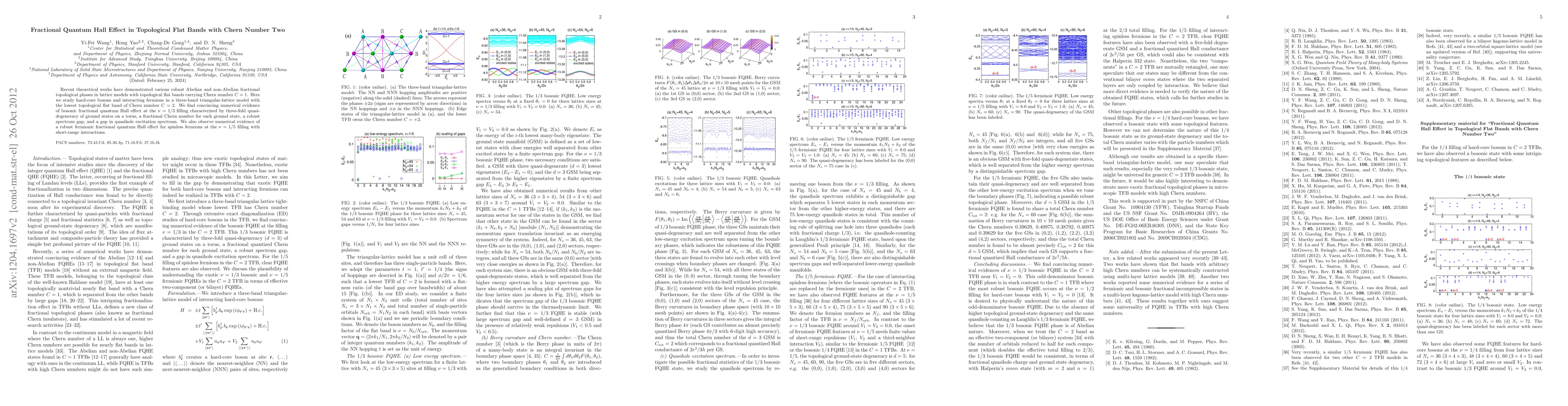 This paper investigates fractional quantum Hall effects in a three-band triangular lattice model with a topological flat band of Chern number C=2. It provides numerical evidence for a bosonic fractional quantum Hall effect at ν=1/3 and a fermionic effect at ν=1/5, showcasing robust ground state degeneracies and gapped excitations.
