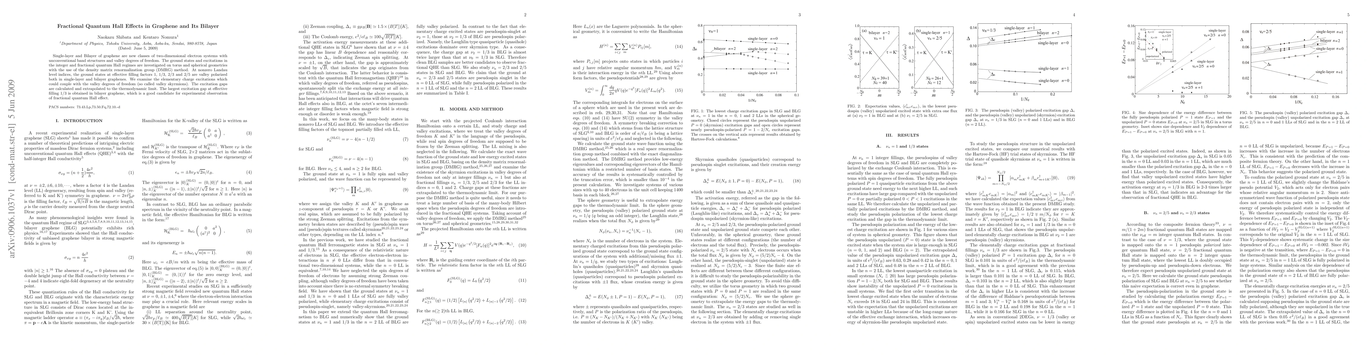 This paper investigates the fractional quantum Hall effects in graphene and its bilayer using the density matrix renormalization group method. The study finds valley polarized ground states at specific filling factors and identifies valley skyrmions as potential charge excitations, with the largest excitation gap at filling factor 1/3 in bilayer graphene, indicating its suitability for experimental observation of the fractional quantum Hall effect.