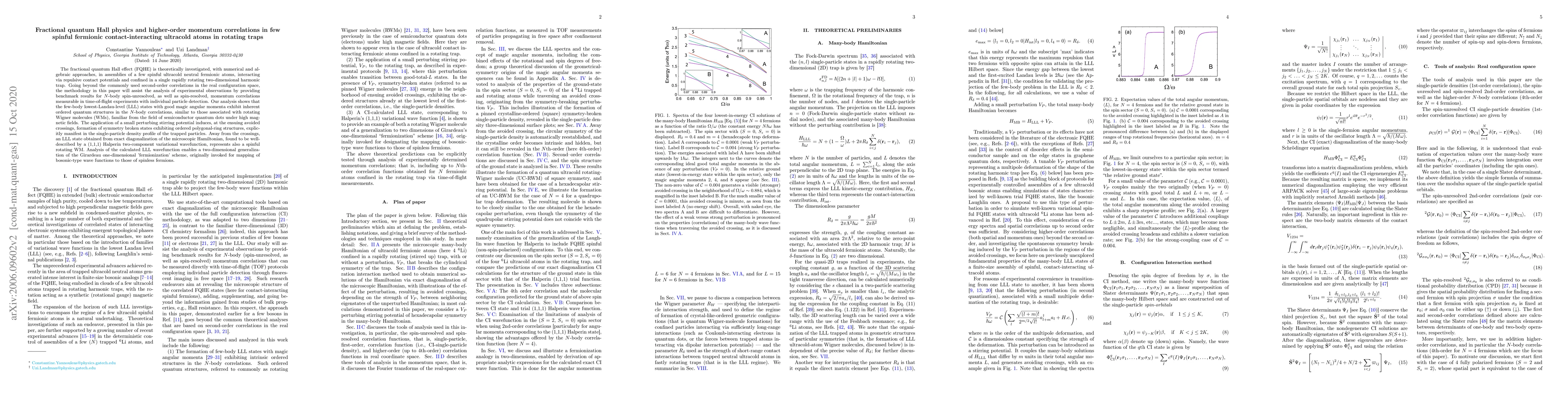 The fractional quantum Hall effect (FQHE) is theoretically investigated, with numerical and algebraic approaches, in assemblies of a few spinful ultracold neutral fermionic atoms, interacting via repulsive contact potentials and confined in a single rapidly rotating two-dimensional harmonic trap. Going beyond the commonly used second-order correlations in the real configuration space, the methodology in this paper will assist the analysis of experimental observations by providing benchmark results for $N$-body spin-unresolved, as well as spin-resolved, momentum correlations measurable in time-of-flight experiments with individual particle detection. Our analysis shows that the few-body lowest-Landau-level (LLL) states with good magic angular momenta exhibit inherent ordered quantum structures in the $N$-body correlations, similar to those associated with rotating Wigner molecules (WMs), familiar from the field of semiconductor quantum dots under high magnetic fields. The application of a small perturbing stirring potential induces, at the ensuing avoided crossings, formation of symmetry broken states exhibiting ordered polygonal-ring structures, explicitly manifest in the single-particle density profile of the trapped particles. Away from the crossings, an LLL state obtained from exact diagonalization of the microscopic Hamiltonian, found to be well-described by a (1,1,1) Halperin two-component variational wavefunction, represents also a spinful rotating WM. Analysis of the calculated LLL wavefunction enables a two-dimensional generalization of the Girardeau one-dimensional 'fermionization' scheme, originally invoked for mapping of bosonic-type wave functions to those of spinless fermions.