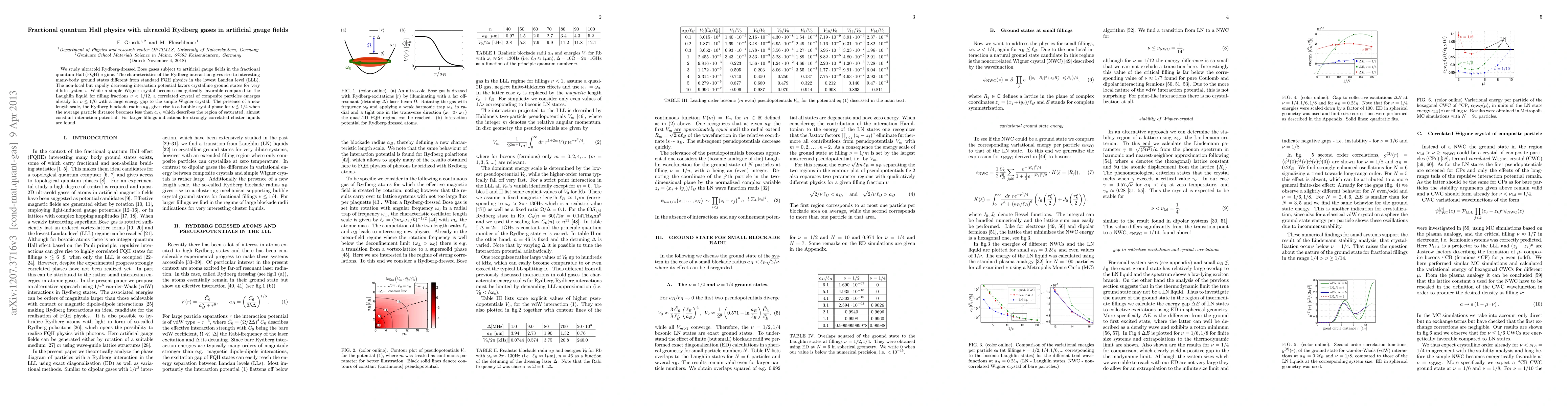 We study ultracold Rydberg-dressed Bose gases subject to artificial gauge fields in the fractional quantum Hall (FQH) regime. The characteristics of the Rydberg interaction gives rise to interesting many-body ground states different from standard FQH physics in the lowest Landau level (LLL). The non-local but rapidly decreasing interaction potential favors crystalline ground states for very dilute systems. While a simple Wigner crystal becomes energetically favorable compared to the Laughlin liquid for filling fractions $\nu<1/12$, a correlated crystal of composite particles emerges already for $\nu \leq 1/6$ with a large energy gap to the simple Wigner crystal. The presence of a new length scale, the Rydberg blockade radius $a_B$, gives rise to a bubble crystal phase for $\nu\lesssim 1/4$ when the average particle distance becomes less than $a_B$, which describes the region of saturated, almost constant interaction potential. For larger fillings indications for strongly correlated cluster liquids are found.