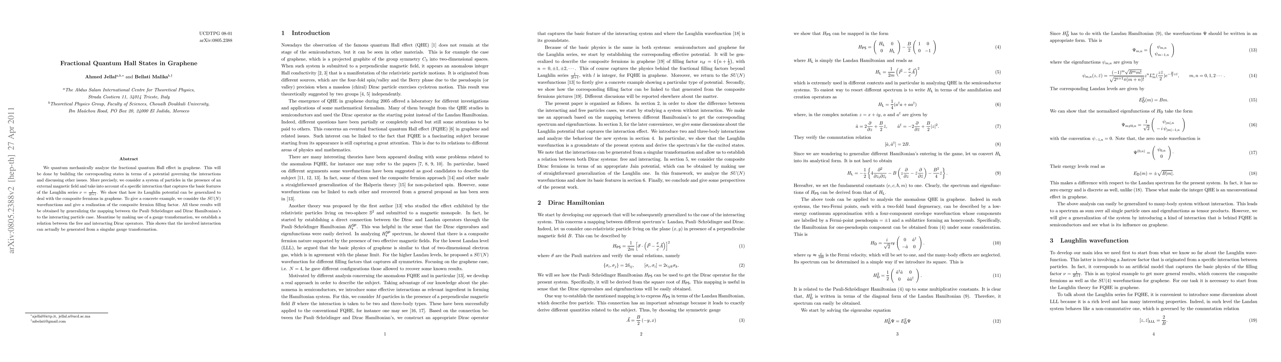 This paper investigates the fractional quantum Hall effect in graphene, focusing on the generalization of the Laughlin potential for composite fermions. It establishes a connection between the Pauli-Schrödinger and Dirac Hamiltonians for interacting particles, demonstrating how the Laughlin series can be realized through SU(N) wavefunctions in graphene.