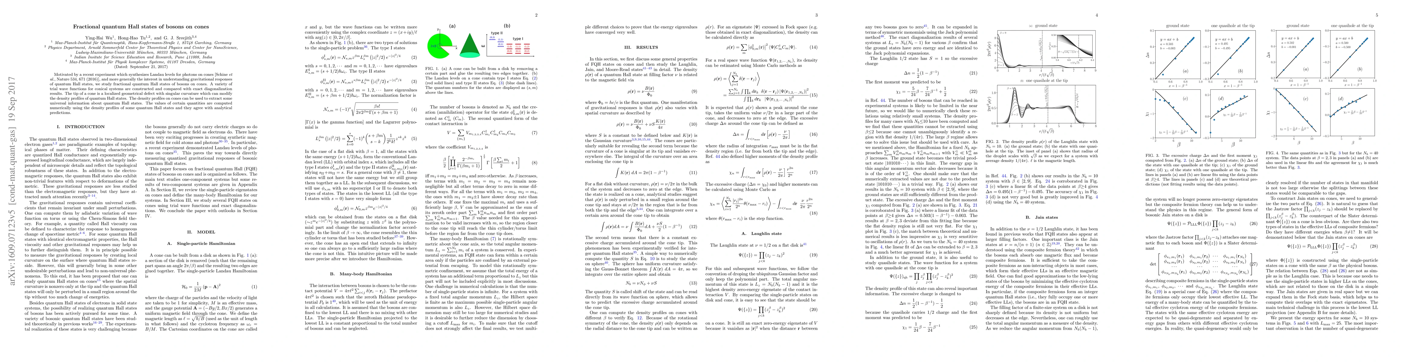 This paper investigates fractional quantum Hall states of bosons on conical geometries, motivated by recent experimental synthesis of photon Landau levels on cones. It constructs and compares various trial wave functions with exact diagonalization results, highlighting the unique density profiles and universal information derived from these states.