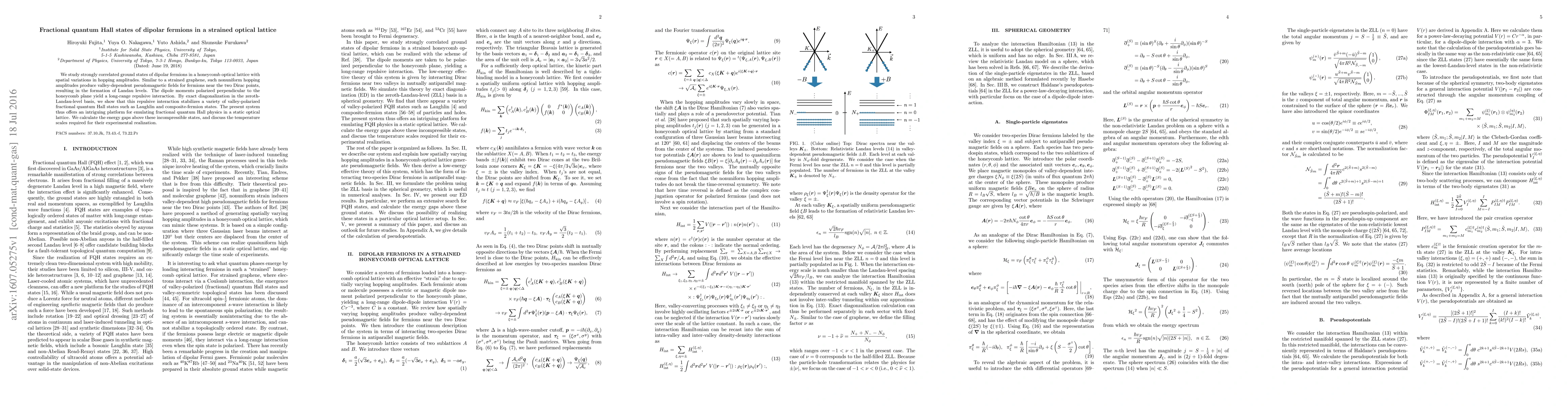 This paper investigates the ground states of dipolar fermions in a strained optical lattice, revealing valley-dependent pseudomagnetic fields that lead to Landau levels. Exact diagonalization shows that long-range repulsive interactions stabilize fractional quantum Hall states, offering a platform for emulating such physics in optical lattices, with calculated energy gaps and temperature requirements for experimental realization.