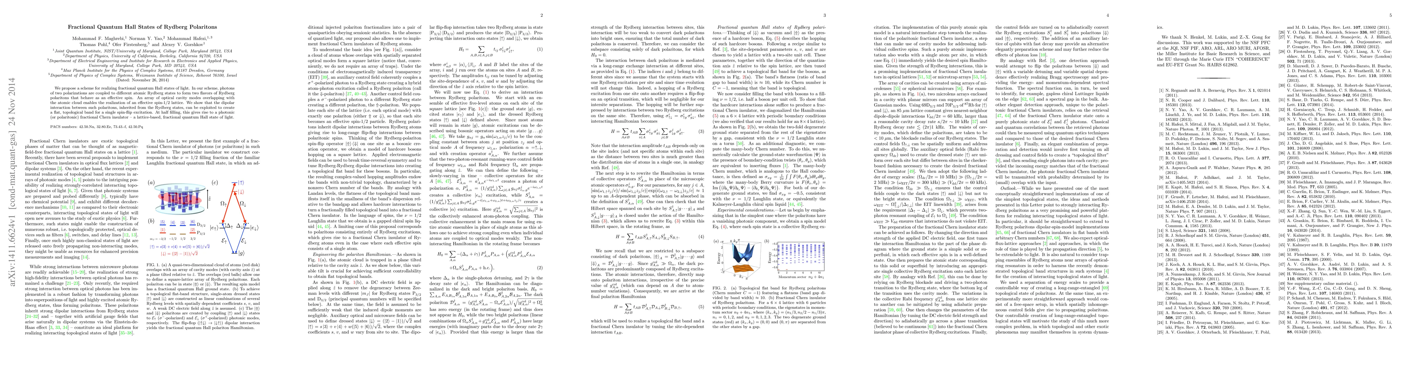 This paper proposes a method to create fractional quantum Hall states using Rydberg polaritons, where photons coupled to Rydberg atoms form effective spin-1/2 lattices. The dipolar interactions between these polaritons enable the formation of a topological band, resulting in a photonic fractional Chern insulator at half filling.