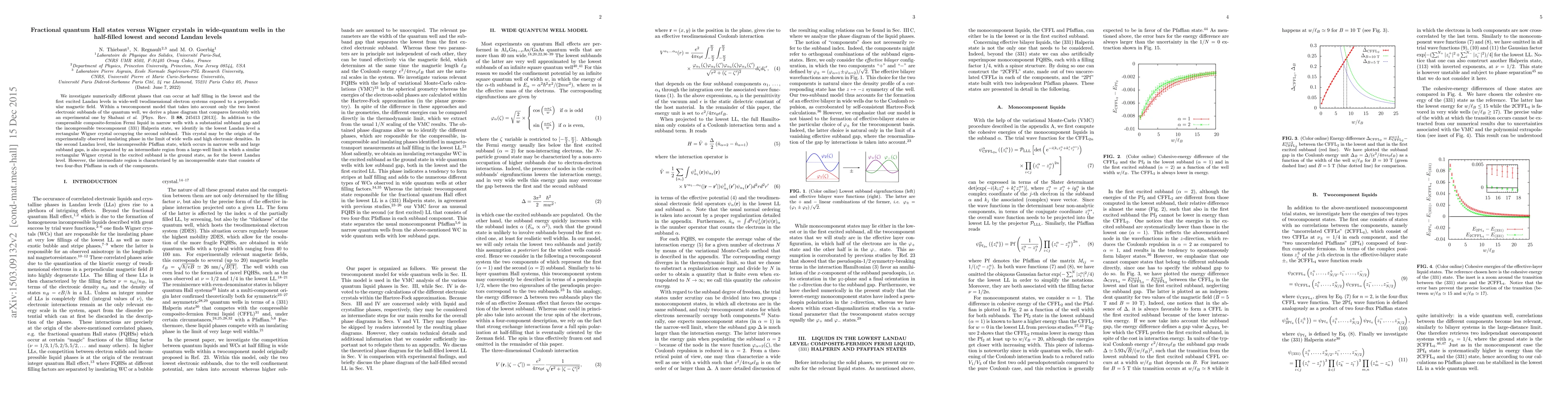We investigate numerically different phases that can occur at half filling in the lowest and the first excited Landau levels in wide-well twodimensional electron systems exposed to a perpendicular magnetic field. Within a twocomponent model that takes into account only the two lowest electronic subbands of the quantum well, we derive a phase diagram that compares favorably with an experimental one by Shabani et al. [Phys. Rev. B 88, 245413 (2013)]. In addition to the compressible composite-fermion Fermi liquid in narrow wells with a substantial subband gap and the incompressible twocomponent (331) Halperin state, we identify in the lowest Landau level a rectangular Wigner crystal occupying the second subband. This crystal may be the origin of the experimentally observed insulating phase in the limit of wide wells and high electronic densities. In the second Landau level, the incompressible Pfaffian state, which occurs in narrow wells and large subband gaps, is also separated by an intermediate region from a large-well limit in which a similar rectangular Wigner crystal in the excited subband is the ground state, as for the lowest Landau level. However, the intermediate region is characterized by an incompressible state that consists of two four-flux Pfaffians in each of the components.