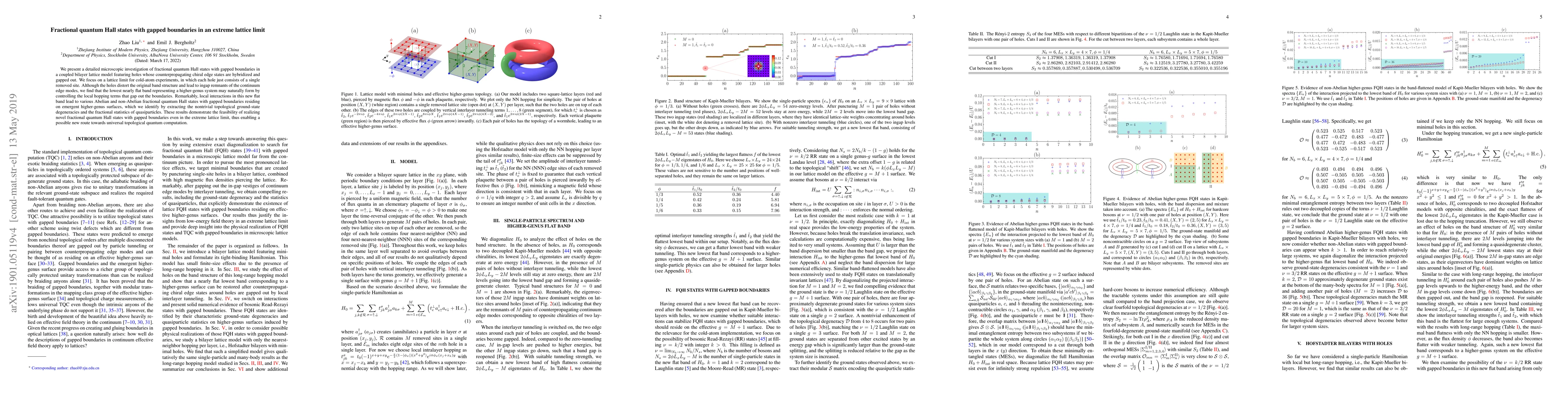 We present a detailed microscopic investigation of fractional quantum Hall states with gapped boundaries in a coupled bilayer lattice model featuring holes whose counterpropagating chiral edge states are hybridized and gapped out. We focus on a lattice limit for cold-atom experiments, in which each hole just consists of a single removed site. Although the holes distort the original band structure and lead to ingap remnants of the continuum edge modes, we find that the lowest nearly flat band representing a higher-genus system may naturally form by controlling the local hopping terms that gap out the boundaries. Remarkably, local interactions in this new flat band lead to various Abelian and non-Abelian fractional quantum Hall states with gapped boundaries residing on emergent higher-genus surfaces, which we identify by extracting the nontrivial topological ground-state degeneracies and the fractional statistics of quasiparticles. These results demonstrate the feasibility of realizing novel fractional quantum Hall states with gapped boundaries even in the extreme lattice limit, thus enabling a possible new route towards universal topological quantum computation.
