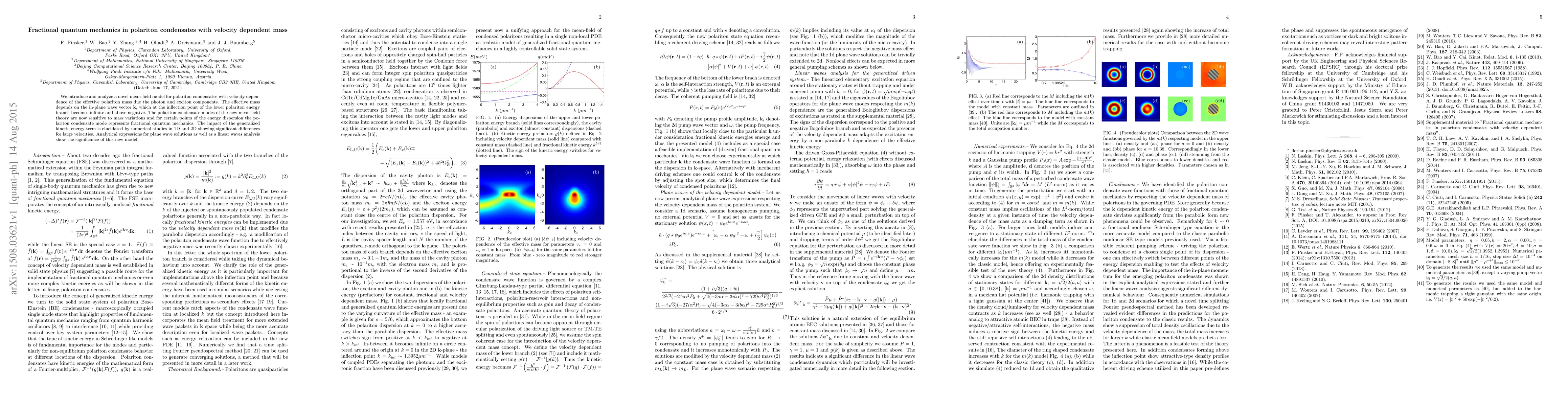 This paper proposes a novel mean-field model for polariton condensates where the effective mass varies with velocity, leading to fractional quantum mechanics at certain energy dispersion points. Numerical studies reveal significant differences in behavior for large velocities, highlighting the importance of the generalized kinetic energy term.
