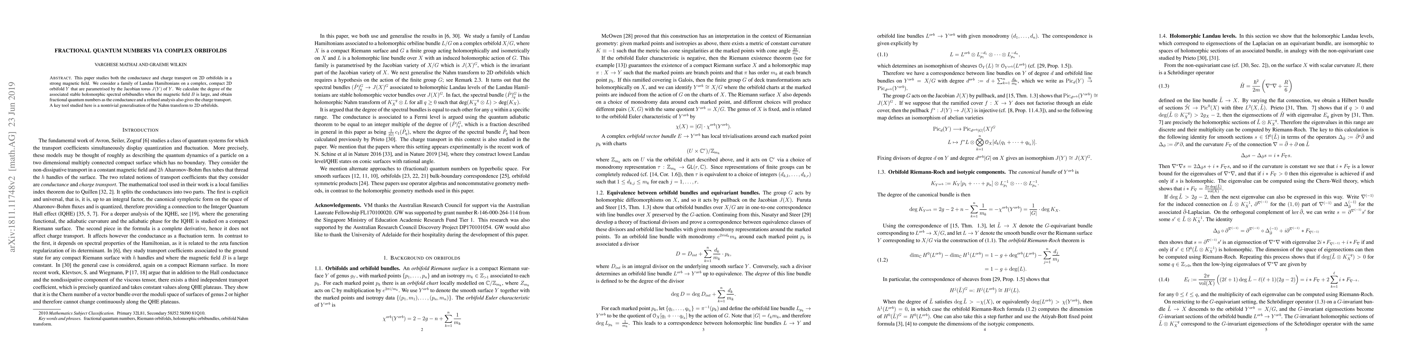 This paper examines conductance and charge transport in 2D orbifolds under strong magnetic fields, revealing fractional quantum numbers through a generalized Nahm transform, alongside a detailed analysis of stable holomorphic spectral orbibundles.