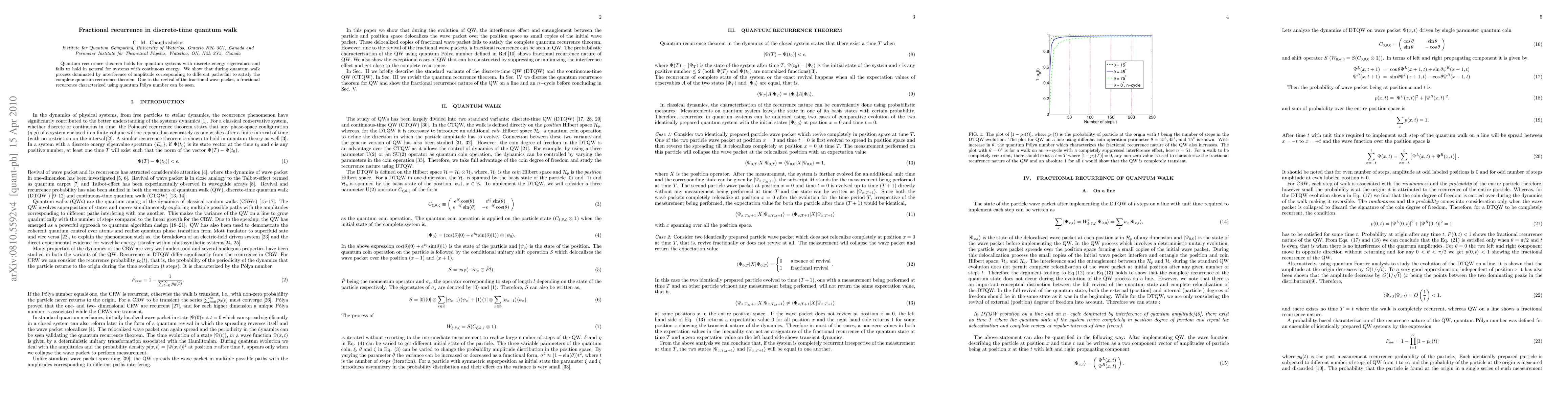 Summary: This paper explores quantum recurrence in discrete-time quantum walks, demonstrating that fractional recurrence emerges due to interference in amplitude paths, contrasting with the complete recurrence theorem in systems with discrete energy eigenvalues. The phenomenon is quantified using a fractional quantum Pólya number.