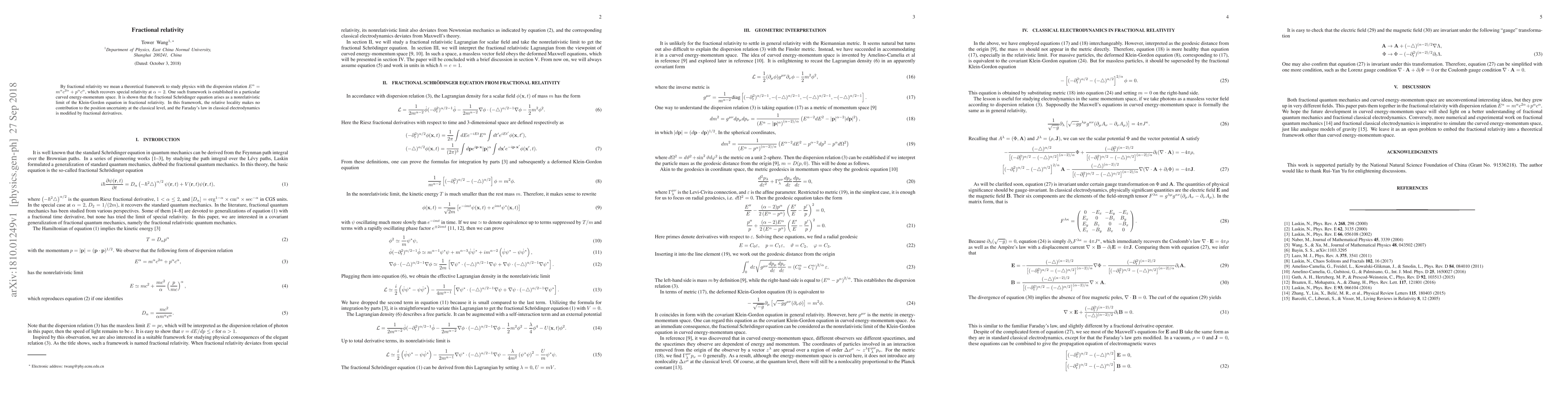By fractional relativity we mean a theoretical framework to study physics with the dispersion relation $E^{\alpha}=m^{\alpha}c^{2\alpha}+p^{\alpha}c^{\alpha}$, which recovers special relativity at $\alpha=2$. One such framework is established in a particular curved energy-momentum space. It is shown that the fractional Schr\"{o}dinger equation arises as a nonrelativistic limit of the Klein-Gordon equation in fractional relativity. In this framework, the relative locality makes no contribution to the position uncertainty at the classical level, and the Faraday's law in classical electrodynamics is modified by fractional derivatives.