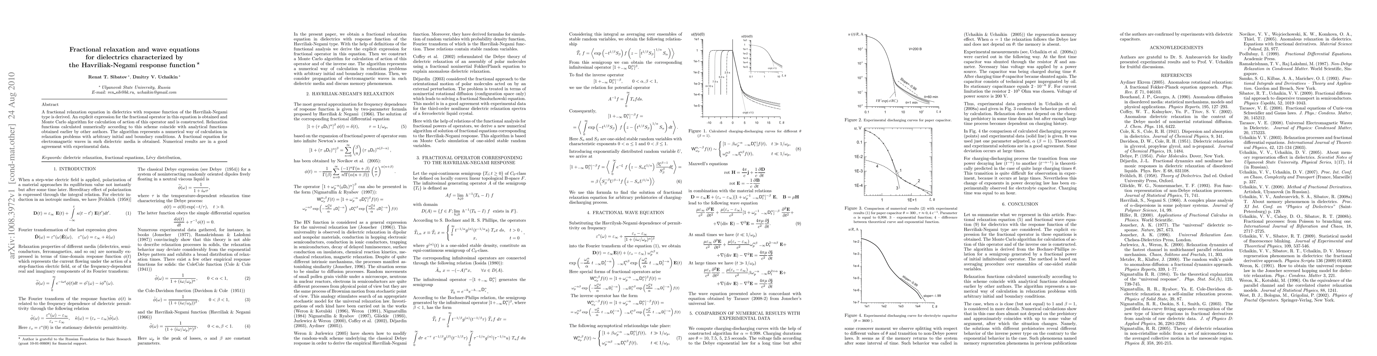 Researchers derived a fractional relaxation equation for dielectrics with a Havriliak-Negami response function, confirming numerical results match analytical functions and showing good agreement with experimental data.