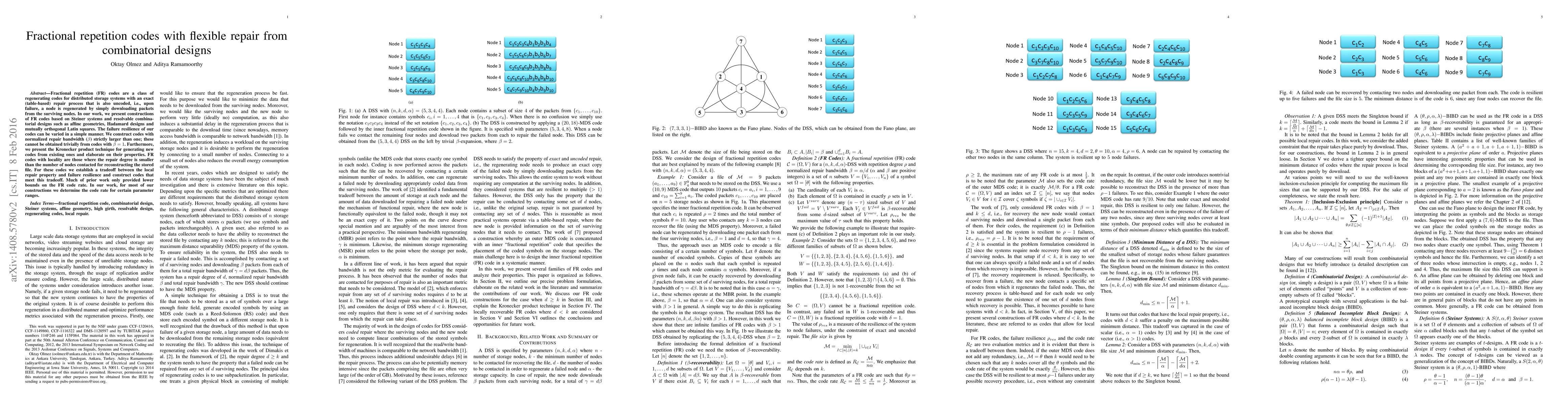 This paper constructs fractional repetition codes based on combinatorial designs for distributed storage systems, offering flexible repair and varying failure resilience. It introduces a Kronecker product technique for generating new codes and establishes a tradeoff between local repair and failure resilience, achieving exact code rates for many constructions.