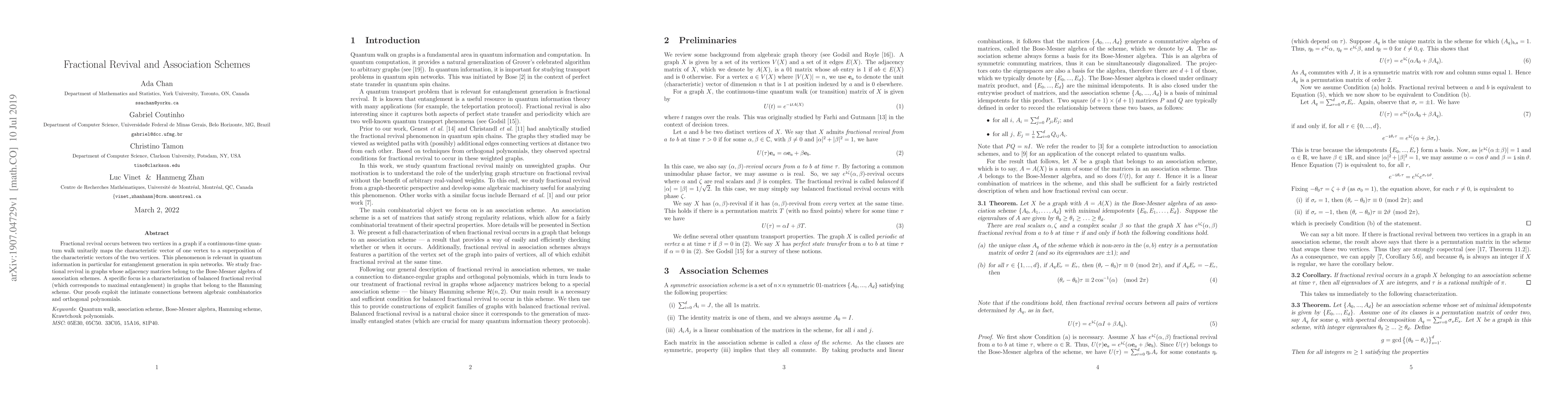 Fractional revival occurs between two vertices in a graph if a continuous-time quantum walk unitarily maps the characteristic vector of one vertex to a superposition of the characteristic vectors of the two vertices. This phenomenon is relevant in quantum information in particular for entanglement generation in spin networks. We study fractional revival in graphs whose adjacency matrices belong to the Bose-Mesner algebra of association schemes. A specific focus is a characterization of balanced fractional revival (which corresponds to maximal entanglement) in graphs that belong to the Hamming scheme. Our proofs exploit the intimate connections between algebraic combinatorics and orthogonal polynomials.