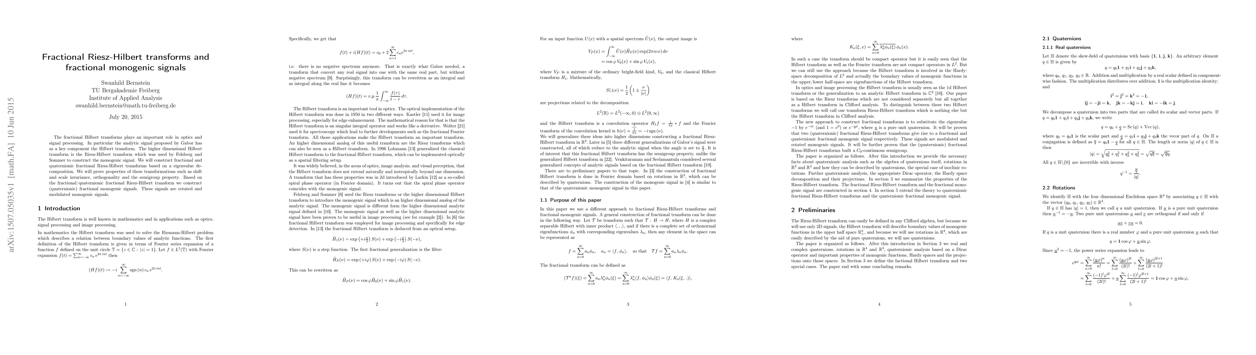 The fractional Hilbert transforms plays an important role in optics and signal processing. In particular the analytic signal proposed by Gabor has as a key component the Hilbert transform. The higher dimensional Hilbert transform is the Riesz-Hilbert transform which was used by Felsberg and Sommer to construct the monogenic signal. We will construct fractional and quaternionic fractional Riesz-Hilbert transforms based on a eigenvalue decomposition. We will prove properties of these transformations such as shift and scale invariance, orthogonality and the semigroup property. Based on the fractional/quaternionic fractional Riesz-Hilbert transform we construct (quaternionic) fractional monogenic signals. These signals are rotated and modulated monogenic signals.