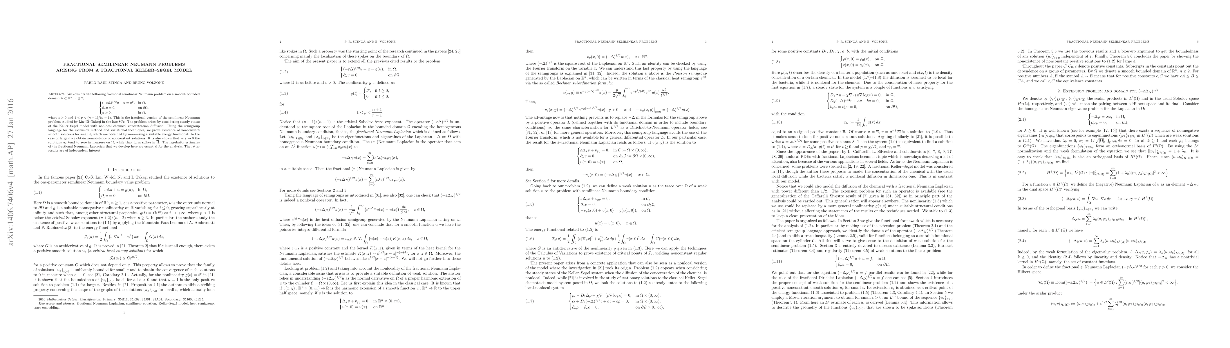 We consider the following fractional semilinear Neumann problem on a smooth bounded domain $\Omega\subset\mathbb{R}^n$, $n\geq2$, $$\begin{cases} (-\varepsilon\Delta)^{1/2}u+u=u^{p},&\hbox{in}~\Omega,\\ \partial_\nu u=0,&\hbox{on}~\partial\Omega,\\ u>0,&\hbox{in}~\Omega, \end{cases}$$ where $\varepsilon>0$ and $1
