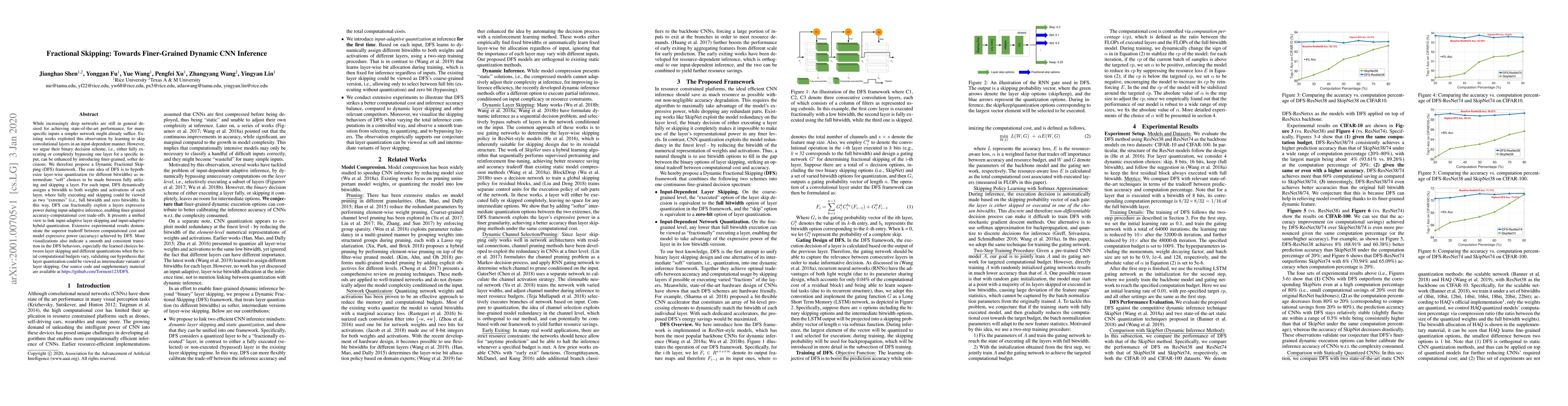 The paper proposes a Dynamic Fractional Skipping (DFS) framework to enhance dynamic convolutional layer skipping in CNNs through finer-grained, "softer" decisions. DFS dynamically assigns bitwidths to layer weights and activations, enabling a smoother trade-off between computational cost and model accuracy.