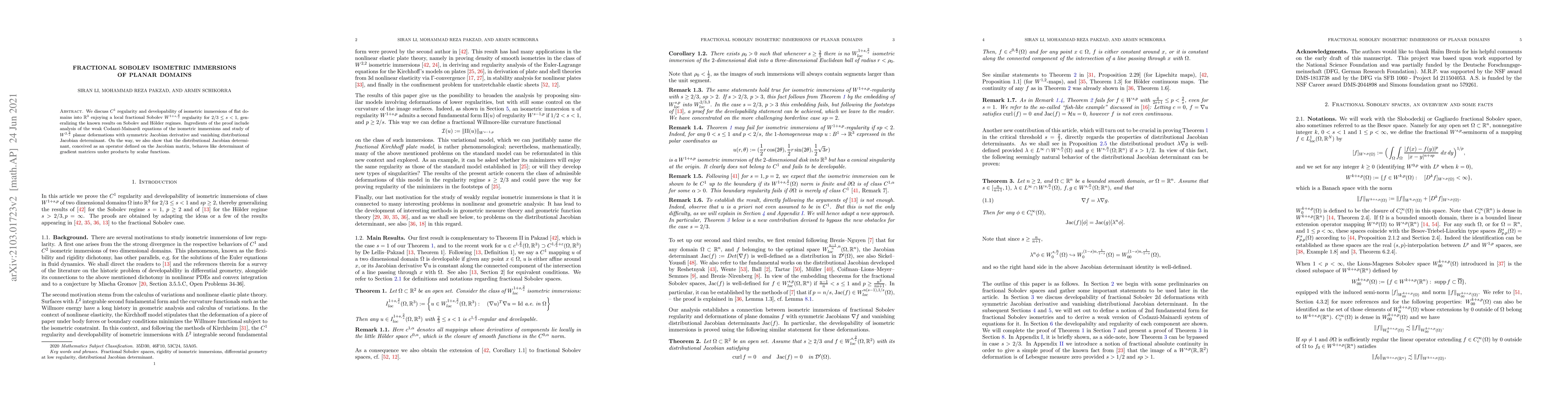 We discuss $C^1$ regularity and developability of isometric immersions of flat domains into $\mathbb R^3$ enjoying a local fractional Sobolev $W^{1+s, \frac2s}$ regularity for $2/3 \le s< 1 $, generalizing the known results on Sobolev and H\"older regimes. Ingredients of the proof include analysis of the weak Codazzi-Mainardi equations of the isometric immersions and study of $W^{2,\frac2s}$ planar deformations with symmetric Jacobian derivative and vanishing distributional Jacobian determinant. On the way, we also show that the distributional Jacobian determinant, conceived as an operator defined on the Jacobian matrix, behaves like determinant of gradient matrices under products by scalar functions.
