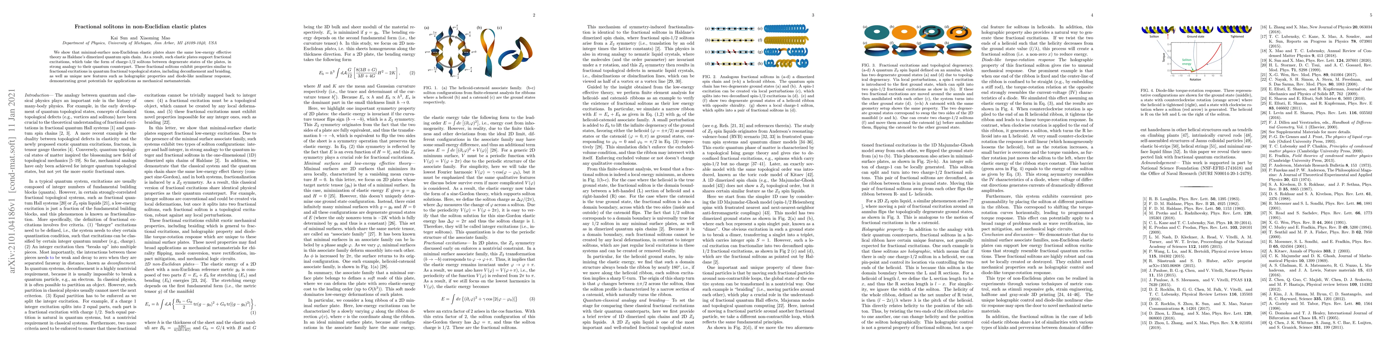 We show that minimal-surface non-Euclidean elastic plates share the same low-energy effective theory as Haldane's dimerized quantum spin chain. As a result, such elastic plates support fractional excitations, which take the form of charge-$1/2$ solitons between degenerate states of the plates, in strong analogy to their quantum counterpart. These fractional solitons exhibit properties similar to fractional excitations in quantum fractional topological states, including deconfinement and braiding, as well as unique new features such as holographic properties and diode-like nonlinear response, demonstrating great potentials for applications as mechanical metamaterials.