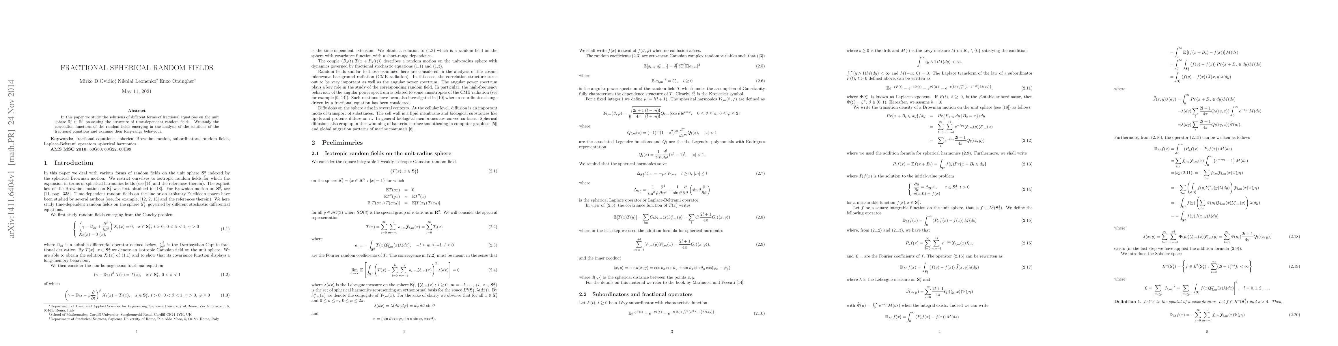 The paper studies solutions of fractional equations on the unit sphere, analyzing their correlation functions and long-range behavior as random fields.