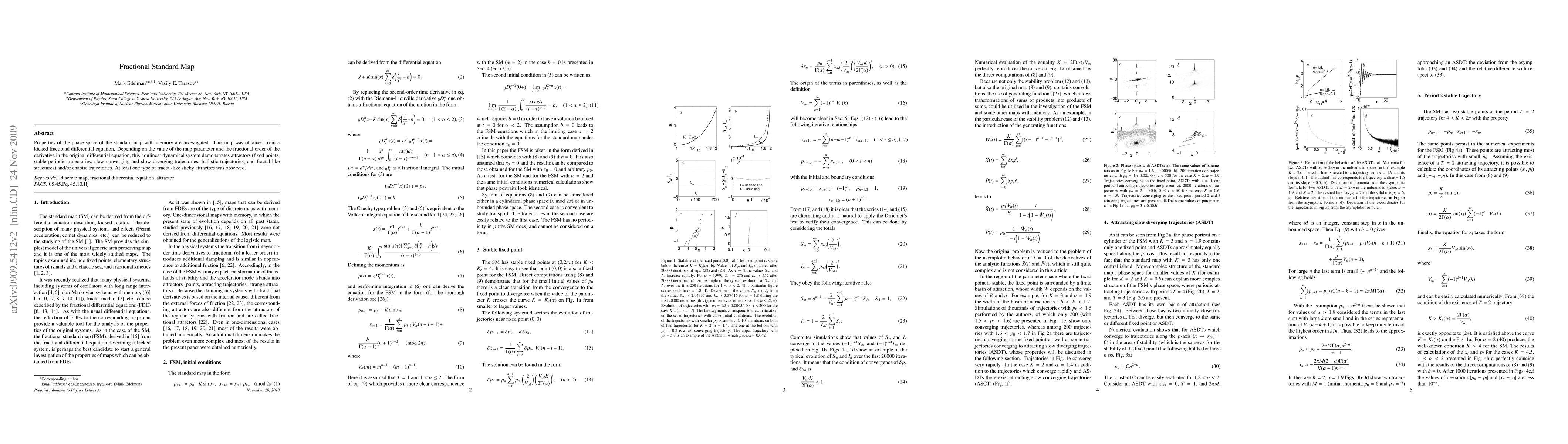 Properties of the phase space of the standard map with memory are investigated. This map was obtained from a kicked fractional differential equation. Depending on the value of the parameter of the map and the fractional order of the derivative in the original differential equation this nonlinear dynamical system demonstrates attractors (fixed points, stables periodic trajectories, slow converging and slow diverging trajectories, ballistic trajectories, and fractal-like structures) and/or chaotic trajectories. At least one type of fractal-like sticky attractors in the chaotic sea was observed.