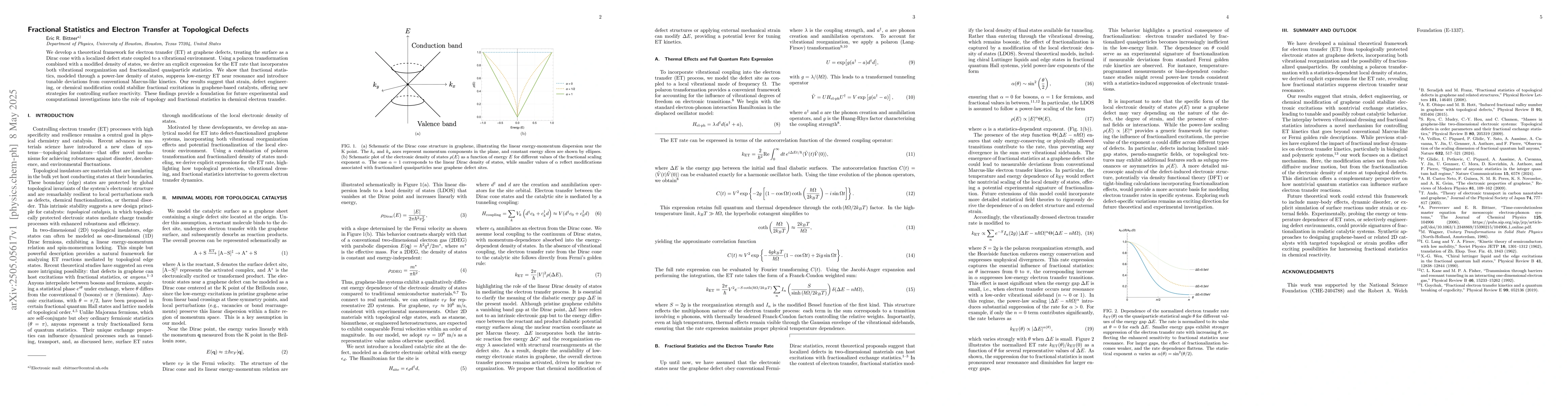 We develop a theoretical framework for electron transfer (ET) at graphene defects, treating the surface as a Dirac cone with a localized defect state coupled to a vibrational environment. Using a polaron transformation combined with a modified density of states, we derive an explicit expression for the ET rate that incorporates both vibrational reorganization and fractionalized quasiparticle statistics. We show that fractional statistics, modeled through a power-law density of states, suppress low-energy ET near resonance and introduce tunable deviations from conventional Marcus-like kinetics. Our results suggest that strain, defect engineering, or chemical modification could stabilize fractional excitations in graphene-based catalysts, offering new strategies for controlling surface reactivity. These findings provide a foundation for future experimental and computational investigations into the role of topology and fractional statistics in chemical electron transfer.
