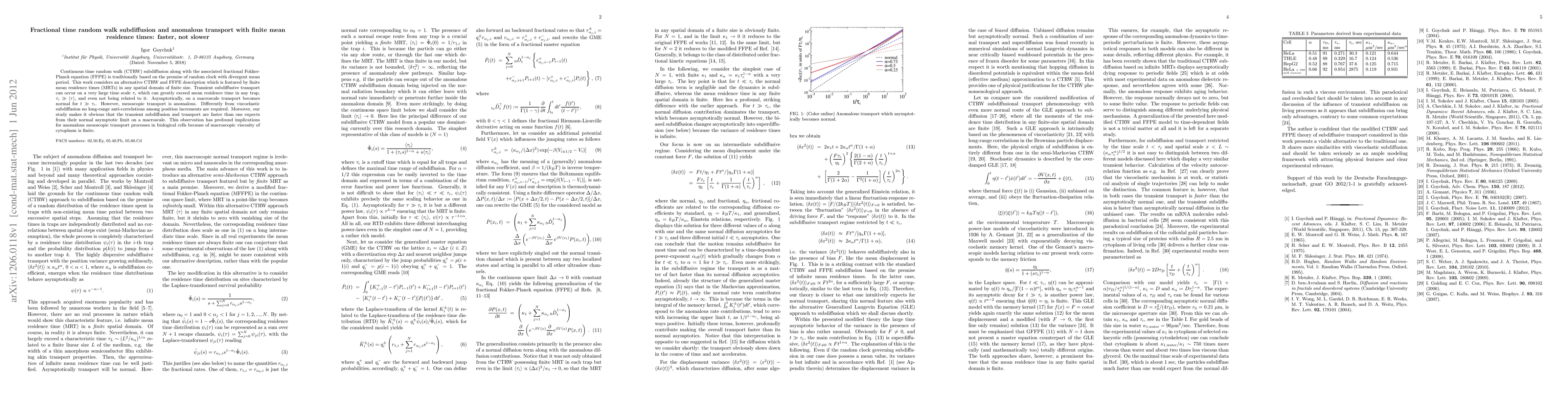 Continuous time random walk (CTRW) subdiffusion along with the associated fractional Fokker-Planck equation (FFPE) is traditionally based on the premise of random clock with divergent mean period. This work considers an alternative CTRW and FFPE description which is featured by finite mean residence times (MRTs) in any spatial domain of finite size. Transient subdiffusive transport can occur on a very large time scale $\tau_c$ which can greatly exceed mean residence time in any trap, $\tau_c\gg <\tau>$, and even not being related to it. Asymptotically, on a macroscale transport becomes normal for $t\gg\tau_c$. However, mesoscopic transport is anomalous. Differently from viscoelastic subdiffusion no long-range anti-correlations among position increments are required. Moreover, our study makes it obvious that the transient subdiffusion and transport are faster than one expects from their normal asymptotic limit on a macroscale. This observation has profound implications for anomalous mesoscopic transport processes in biological cells because of macroscopic viscosity of cytoplasm is finite.