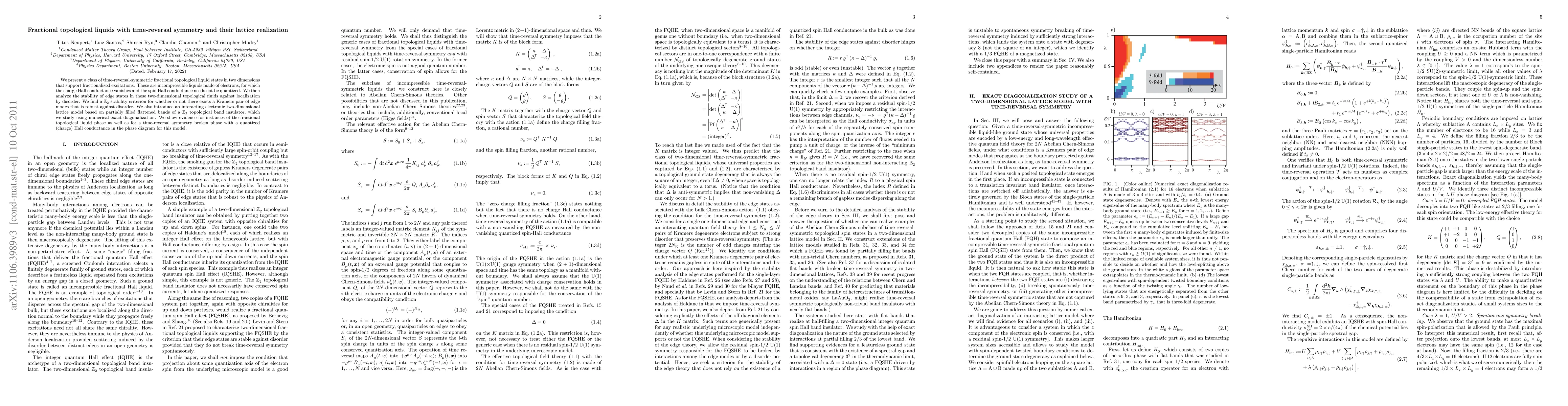 We present a class of time-reversal-symmetric fractional topological liquid states in two dimensions that support fractionalized excitations. These are incompressible liquids made of electrons, for which the charge Hall conductance vanishes and the spin Hall conductance needs not be quantized. We then analyze the stability of edge states in these two-dimensional topological fluids against localization by disorder. We find a Z_2 stability criterion for whether or not there exists a Kramers pair of edge modes that is robust against disorder. We also introduce an interacting electronic two-dimensional lattice model based on partially filled flattened bands of a Z_2 topological band insulator, which we study using numerical exact diagonalization. We show evidence for instances of the fractional topological liquid phase as well as for a time-reversal symmetry broken phase with a quantized (charge) Hall conductance in the phase diagram for this model.