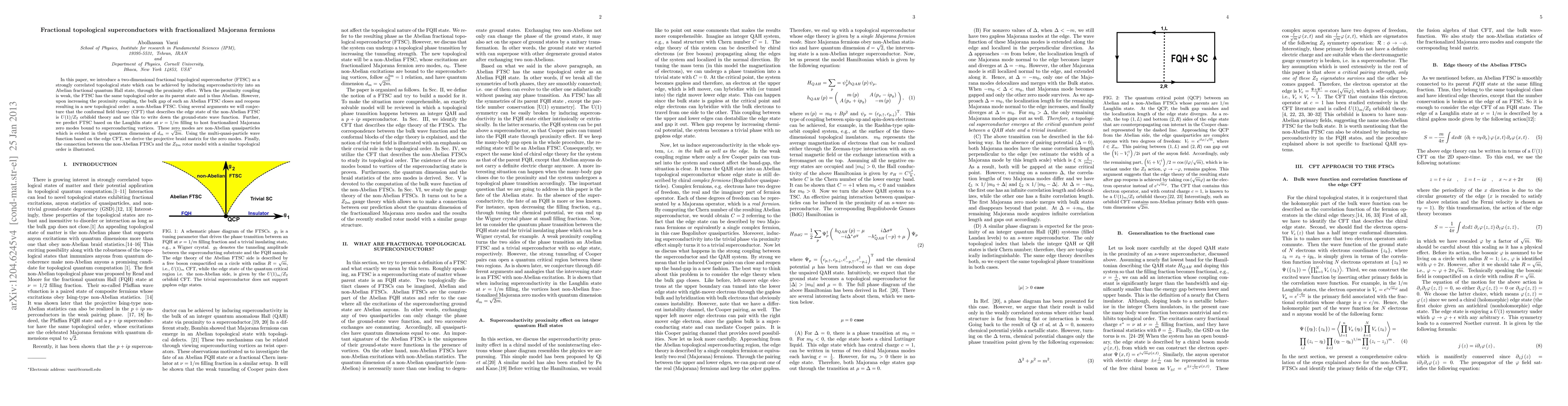 In this paper, we introduce a two-dimensional fractional topological superconductor (FTSC) as a strongly correlated topological state which can be achieved by inducing superconductivity into an Abelian fractional quantum Hall state, through the proximity effect. When the proximity coupling is weak, the FTSC has the same topological order as its parent state and is thus Abelian. However, upon increasing the proximity coupling, the bulk gap of such an Abelian FTSC closes and reopens resulting in a new topological order: a non-Abelian FTSC. Using several arguments we will conjecture that the conformal field theory (CFT) that describes the edge state of the non-Abelian FTSC is $U(1)/Z_2$ orbifold theory and use this to write down the ground-state wave function. Further, we predict FTSC based on the Laughlin state at $\nu=1/m$ filling to host fractionalized Majorana zero modes bound to superconducting vortices. These zero modes are non-Abelian quasiparticles which is evident in their quantum dimension of $d_m=\sqrt{2m}$. Using the multi-quasi-particle wave function based on the edge CFT, we derive the projective braid matrix for the zero modes. Finally, the connection between the non-Abelian FTSCs and the $Z_{2m}$ rotor model with a similar topological order is illustrated.