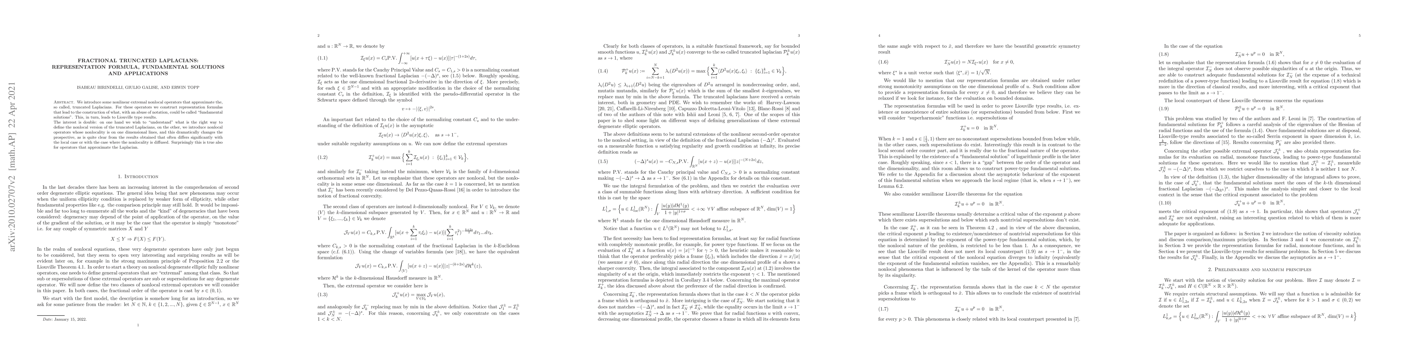 In this note we introduce some nonlinear extremal nonlocal operators that approximate the, so called, truncated Laplacians. For these operators we construct representation formulas that lead to the construction of what, with an abuse of notation, could be called "fundamental solutions". This, in turn, leads to Liouville type results. The interest is double: on one hand we wish to "understand" what is the right way to define the nonlocal version of the truncated Laplacians, on the other, we introduce nonlocal operators whose nonlocality is on one dimensional lines, and this dramatically changes the prospective, as is quite clear from the results obtained that often differs significantly with the local case or with the case where the nonlocality is diffused. Surprisingly this is true also for operators that approximate the Laplacian.