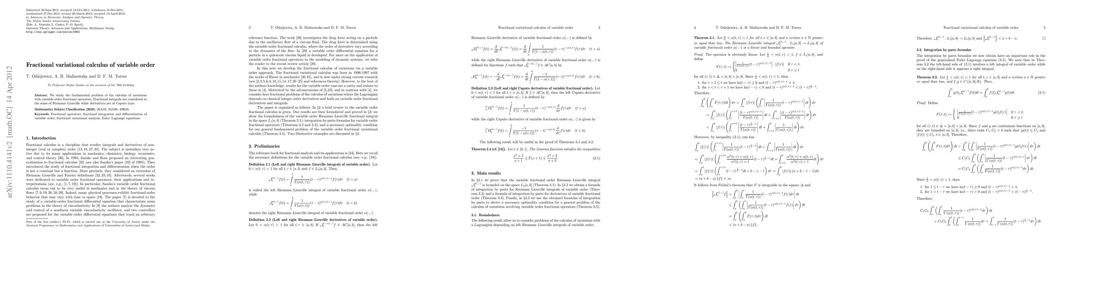 Summary: This paper explores the calculus of variations using variable order fractional operators, employing Riemann-Liouville integrals and Caputo derivatives to address fundamental problems in fractional variational calculus.
