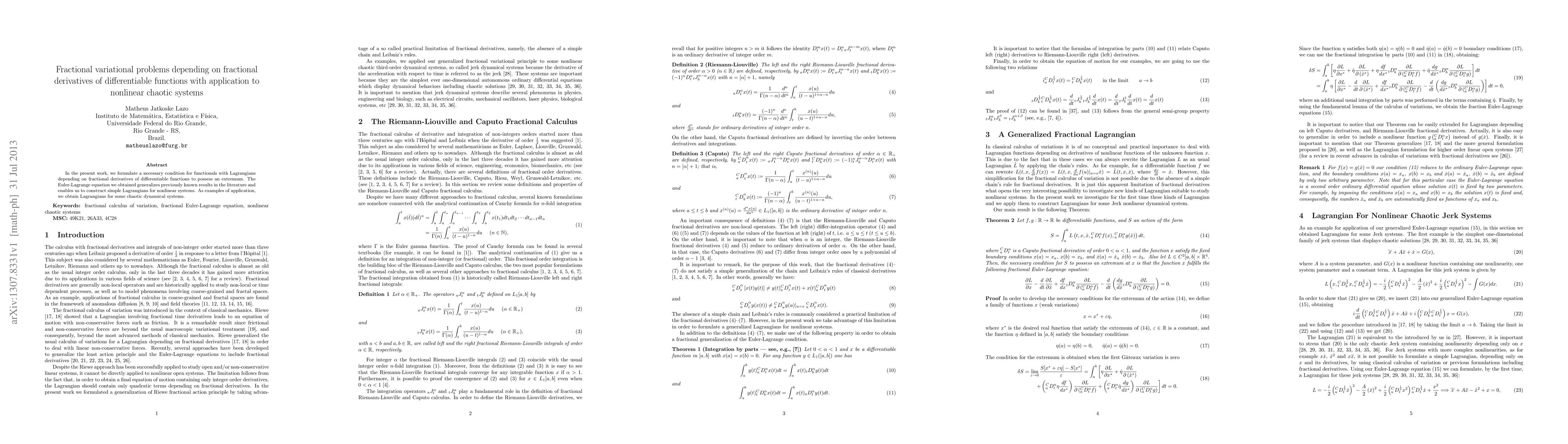 This research paper establishes a necessary condition for functionals with Lagrangians depending on fractional derivatives of differentiable functions to possess an extremum, enabling the construction of simple Lagrangians for nonlinear chaotic systems.