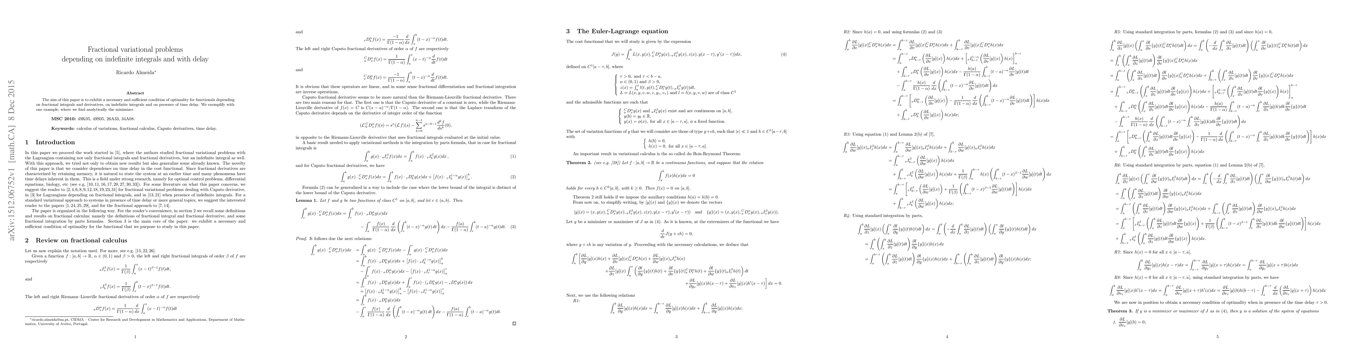 The aim of this paper is to exhibit a necessary and sufficient condition of optimality for functionals depending on fractional integrals and derivatives, on indefinite integrals and on presence of time delay. We exemplify with one example, where we find analytically the minimizer.